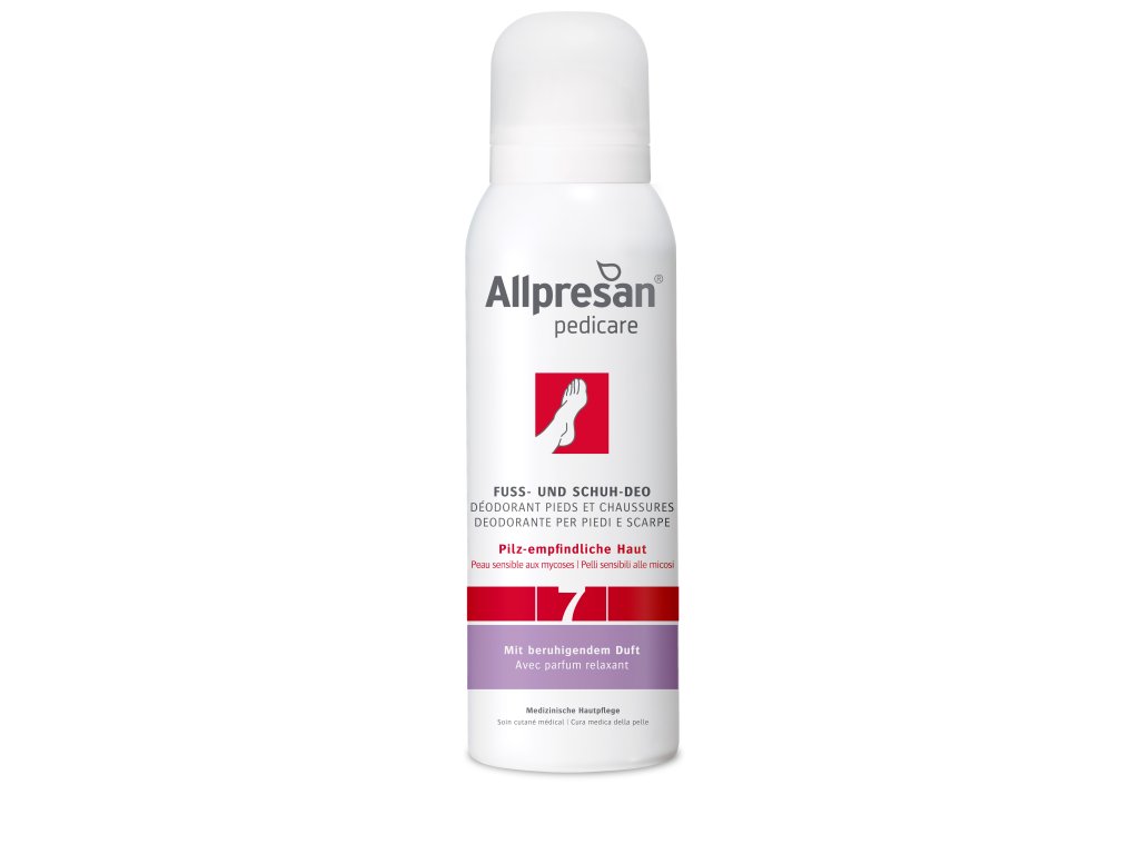 Allpresan Pedicare č.7 je antibakteriální antiperspirant s chladivým účinkem vhodný na nohy i do obuvi. Eliminuje nepříjemné pachy a zajišťuje hygienicky svěží klima nohou. Obsažené antimikrobiální složky bojují proti bakteriím způsobujícím zápach, čímž omezují vznik nepříjemných pachů a také pomáhá snižovat riziko pronikání spór plísní a bakterií do pokožky.