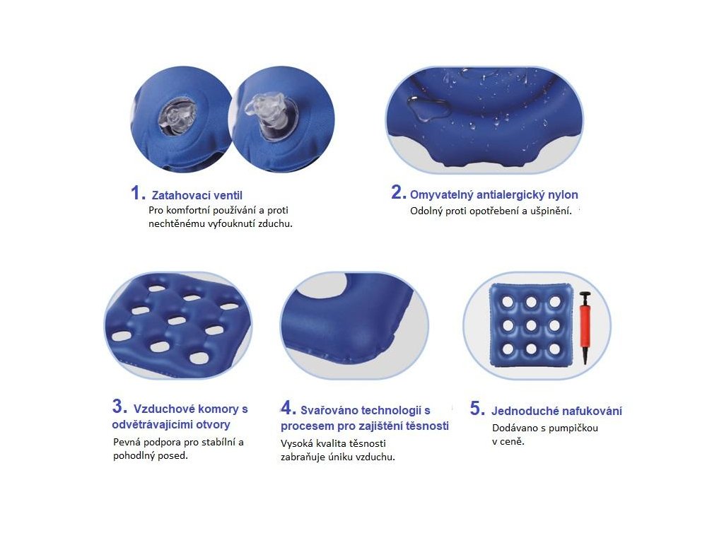 Jedinečný tvar s otvory a možnost měnit tvrdost dofouknutím nebo upuštěním vzduchu zaručují vysoký komfort používání. Je vyroben z vysoce kvalitního omyvatelného antialergického nylonu odolného vůči otěru a tlaku. Díky použití vhodné svařovací technologie nedochází k netěsnosti spojů. Zatahovací ventil zabraňuje náhodnému uvolnění vzduchu z polštáře během používání.