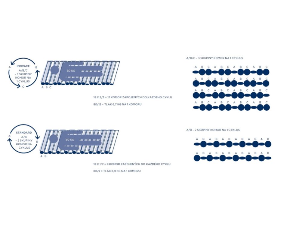 Tato matrace je vybavena inovativním systémem 3 skupin komor A/B/C – po šesti komorách v každé skupině. Během jednoho cyklu jsou nahuštěny vždy dvě skupiny komor, tzn 12 z 18 komor je nahuštěno během každého cyklu. Pro porovnání – běžná antidekubitní matrace (A/B) má nahuštěno vždy pouze 9 komor z 18.