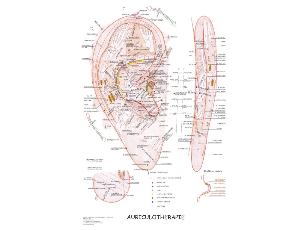 Přehledná mapa přináší ucelený pohled na systém bodů v oblasti ucha. České a latinské popisky. Velikost 47 x 63 cm.