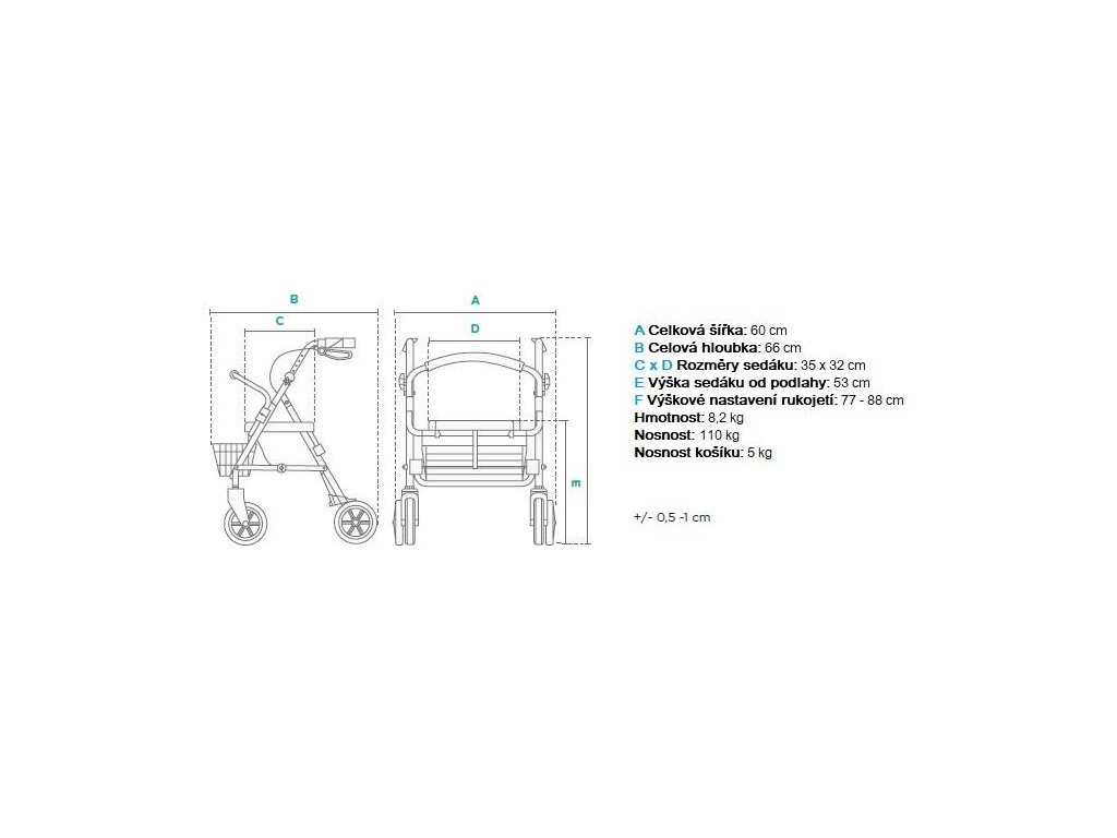 Lehce složitelné pro uskladnění anebo převoz autem – 3 vteřiny bez použití nářadí. Rozměry po složení: 22 × 62 × 81 cm. Pohodlné pevné sedátko. Odnímatelná zádová opěrka. Brzdy s funkcí blokace v parkovací poloze. Pohodlná madla anatomicky tvarovaná, výškově nastavitelná. Odnímatelný košík ve standardní výbavě. Dřžák na hůl/berli Barva: modrá
