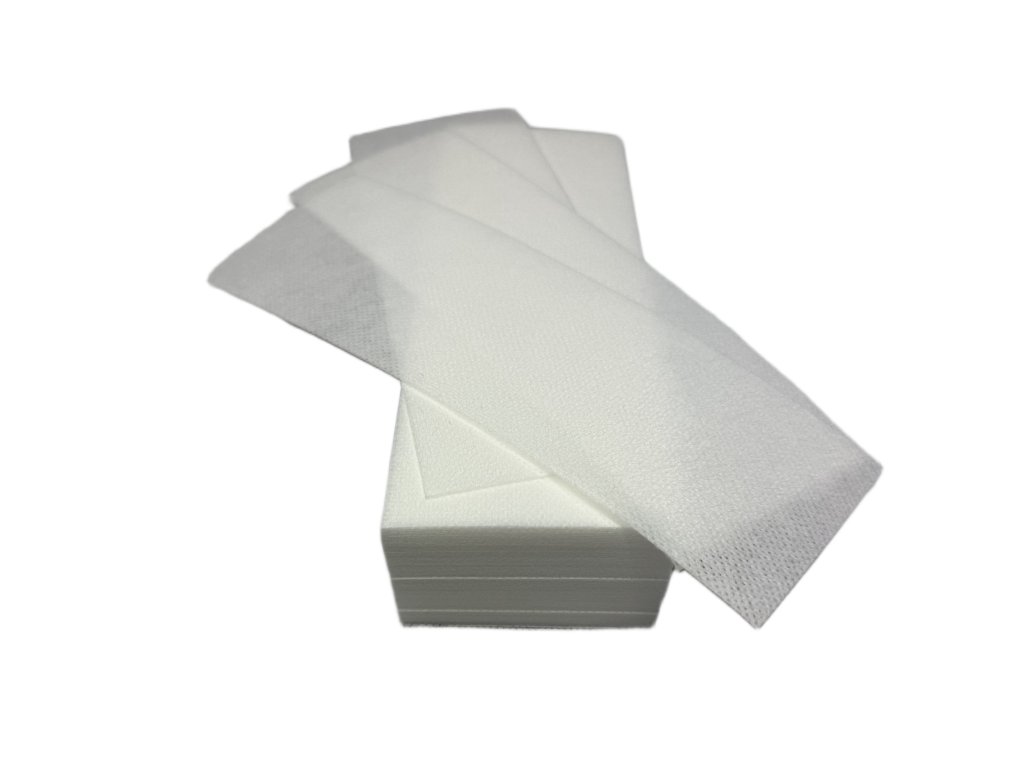 Balení depilačních pásek vyrobených z celulózy a netkané textilie. Možnost použití na tělo, ruce, nohy v kombinaci s depilačním voskem. Pásek bez vosku k depilaci nelze použít.