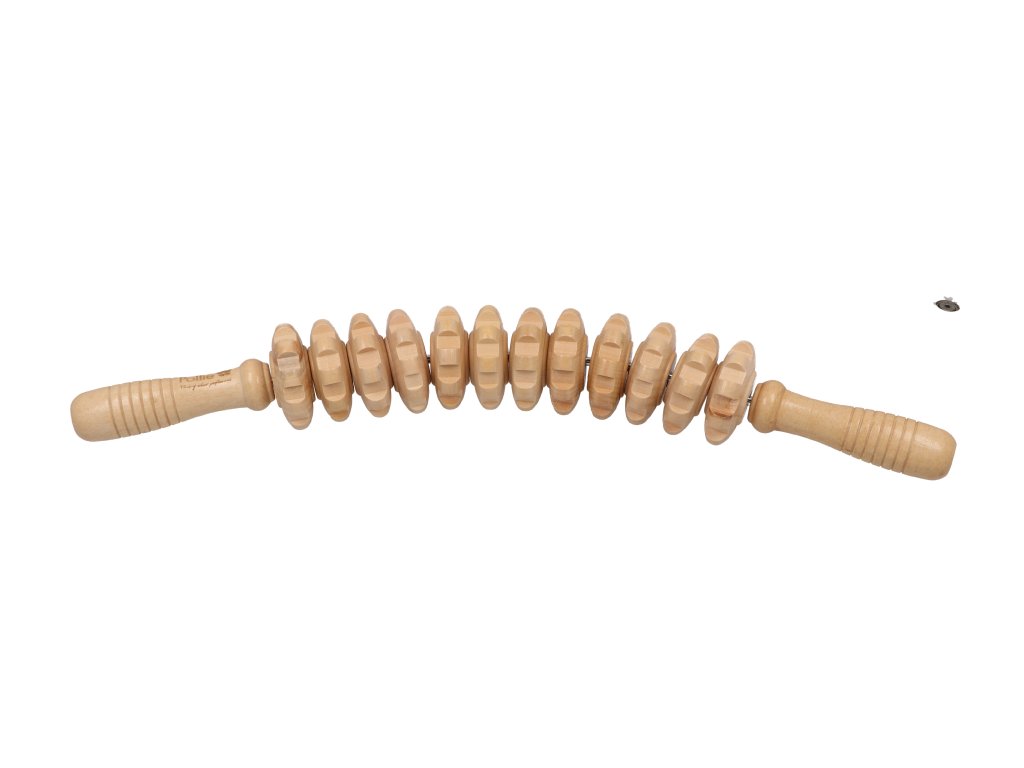 Dřevěný zakřivený masážní váleček s ozubenými disky pro maderoterapii