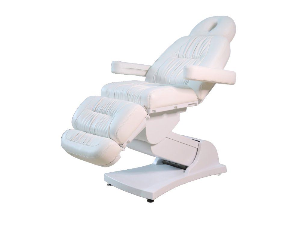 Kosmetické křeslo s elektricky nastavitelnou výškou, zádovou opěrou a nožním dílem.