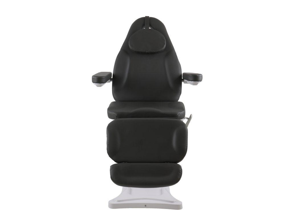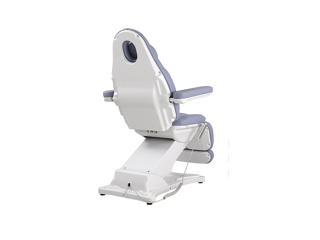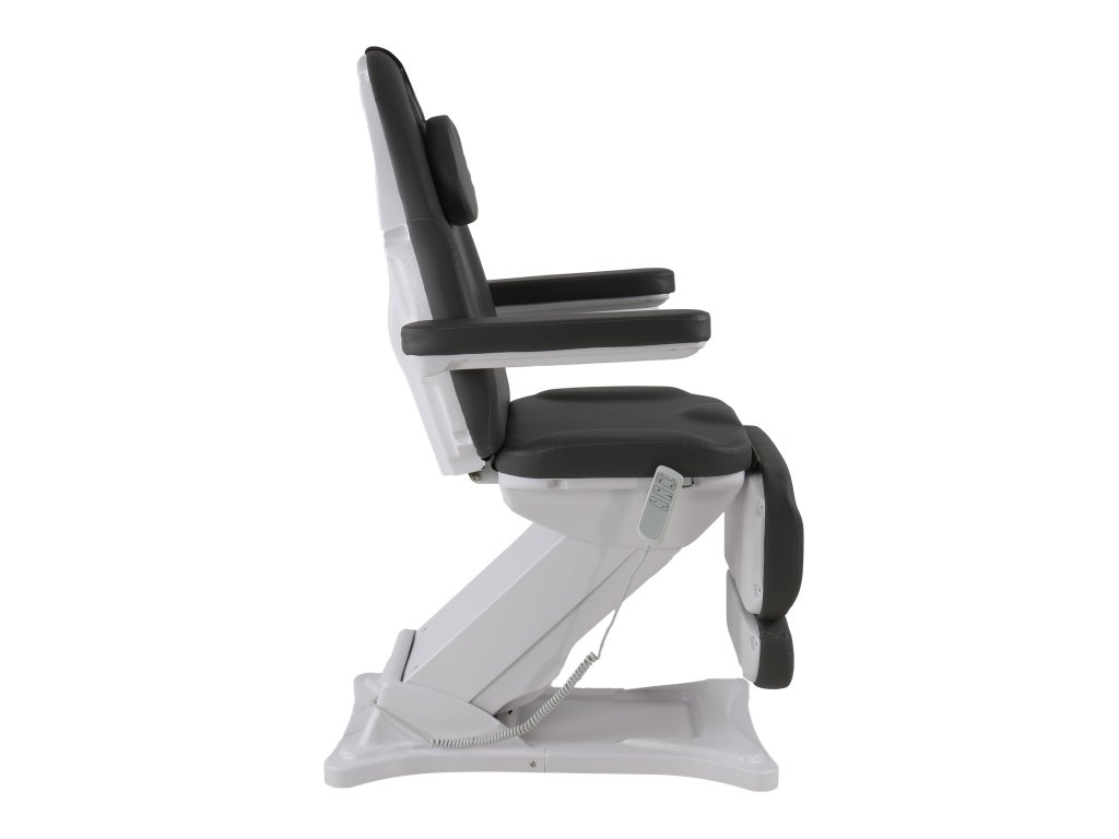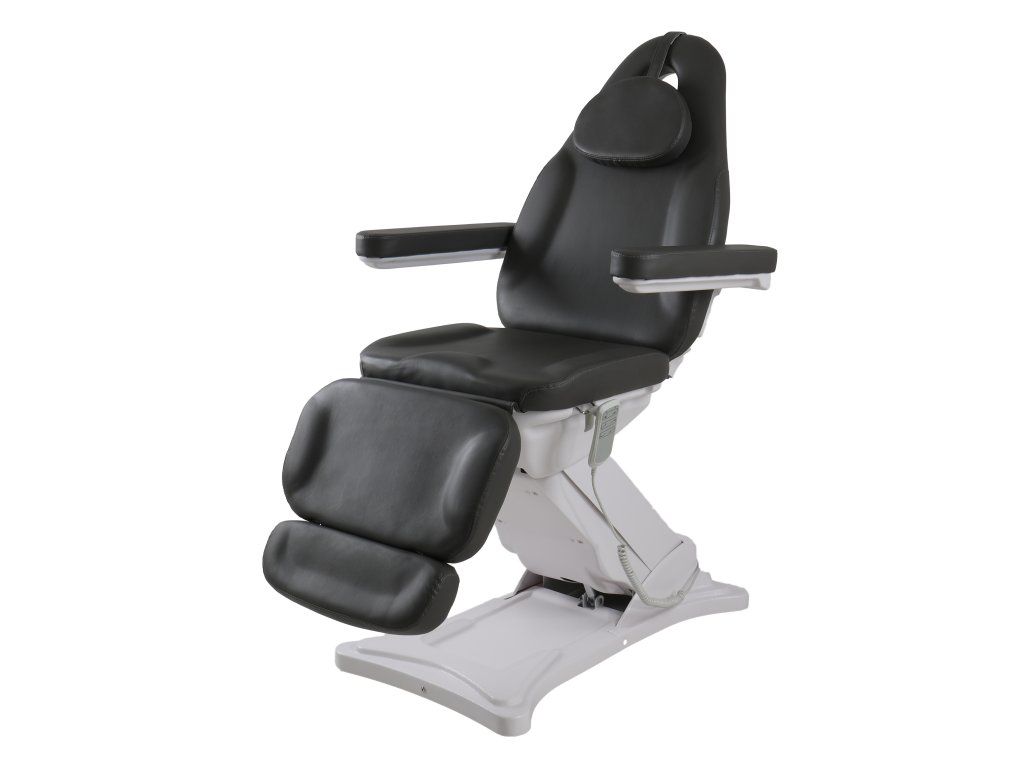 Kosmetické křeslo s elektricky nastavitelnou výškou, zádovou opěrou a nožním dílem.