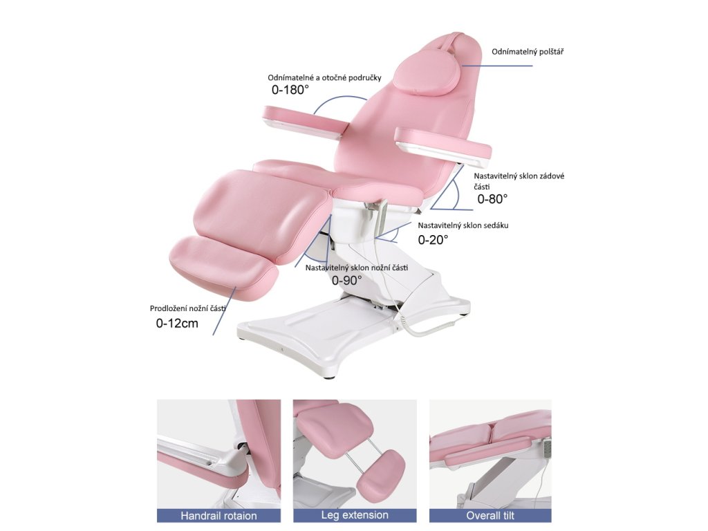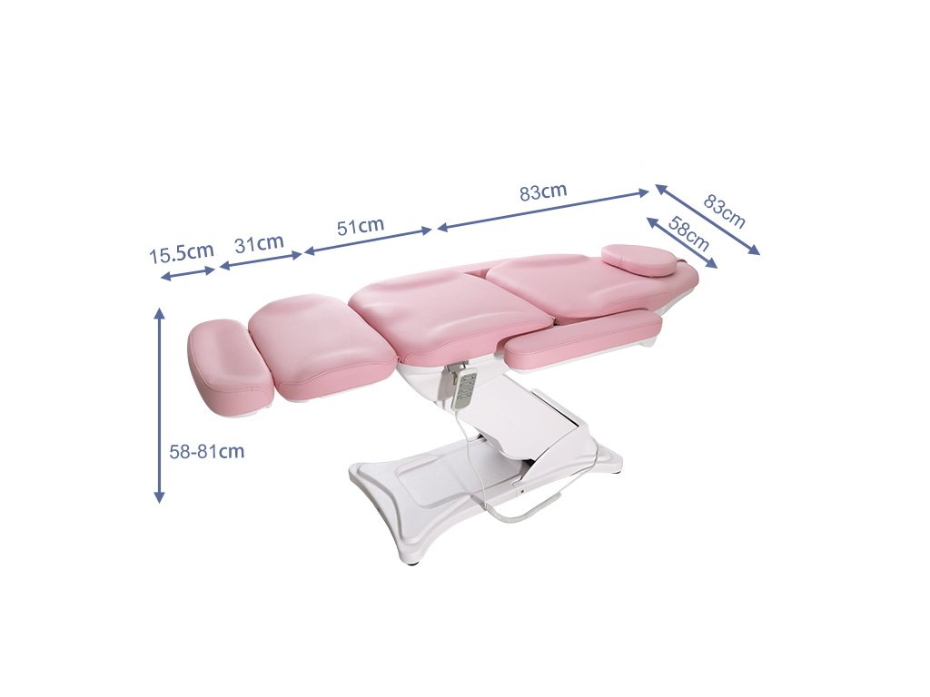 Kosmetické křeslo s elektricky nastavitelnou výškou, sklonem sedáku, zádovou opěrou a nožním dílem. Ovládání pomocí ručního ovladače. Jednotlivé sekce jsou ovládány nezávisle na sobě.