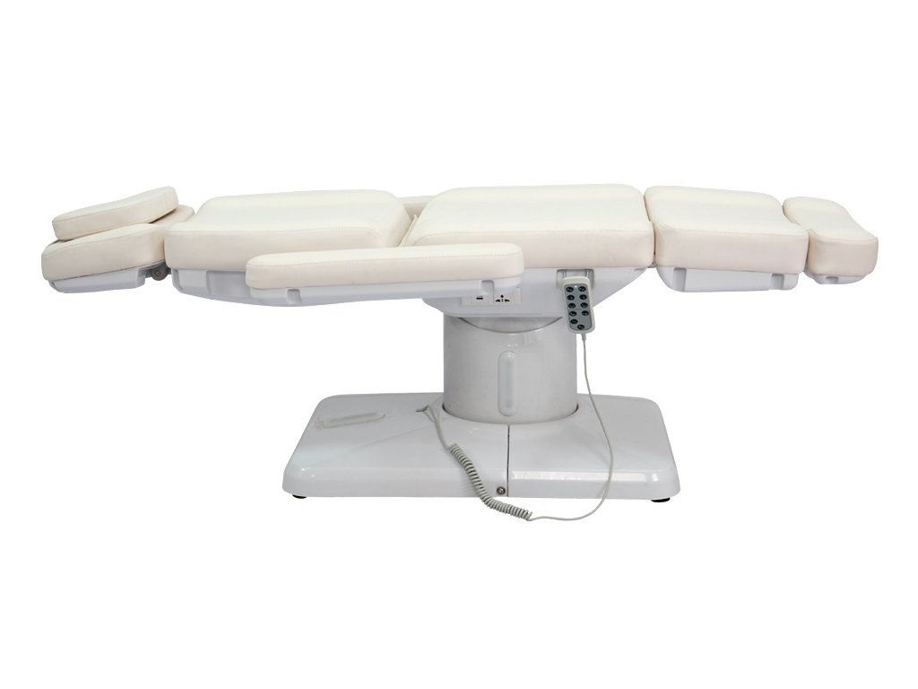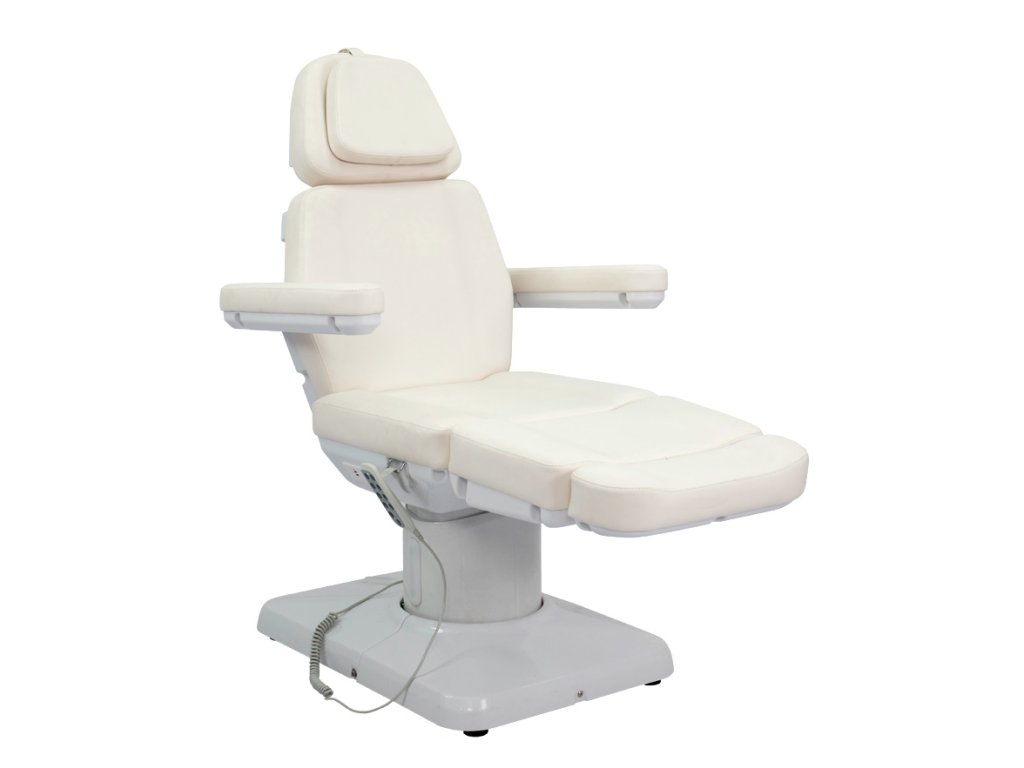 Kosmetické křeslo s elektricky nastavitelnou výškou, zádovou opěrou a sklonem nožního dílu.