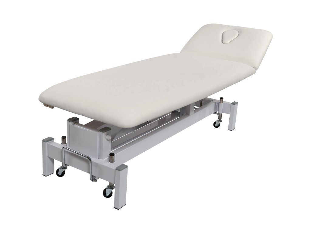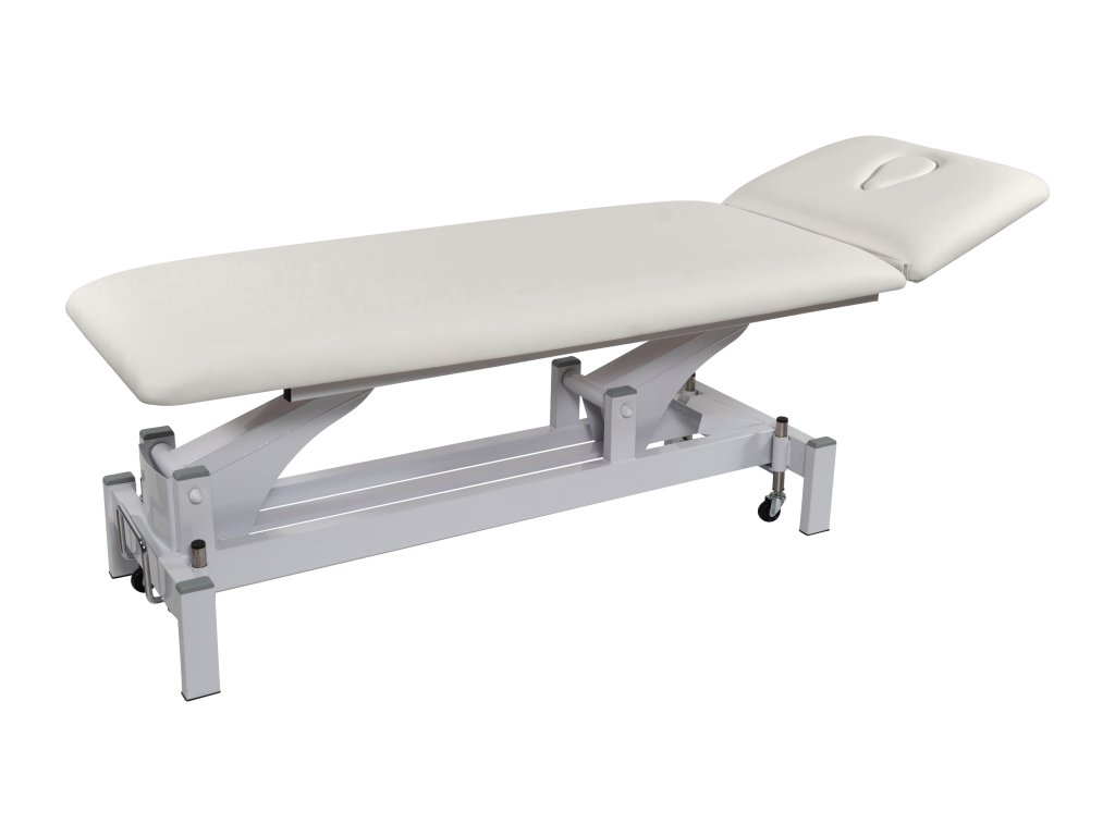 Elektricky nastavitelné lehátko s příjemně silným polstrováním. V ceně kolečka – centrální zdvih.