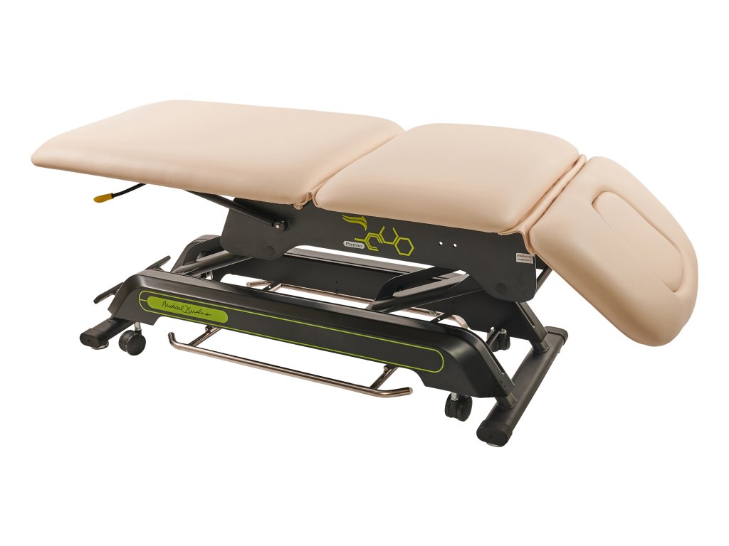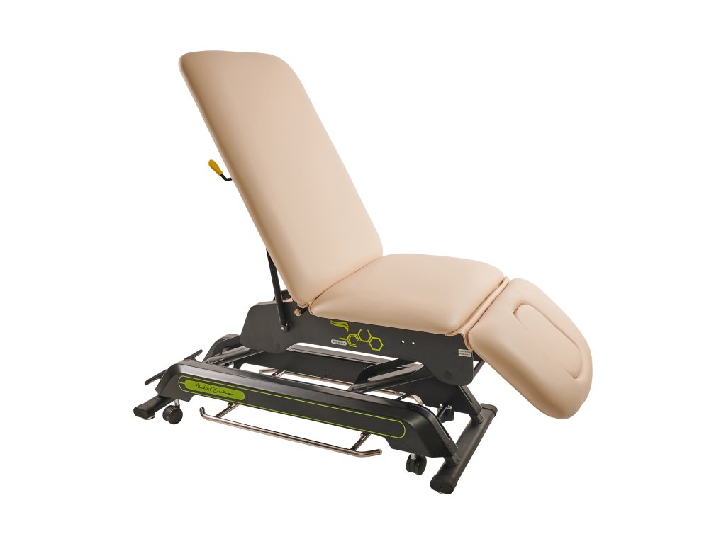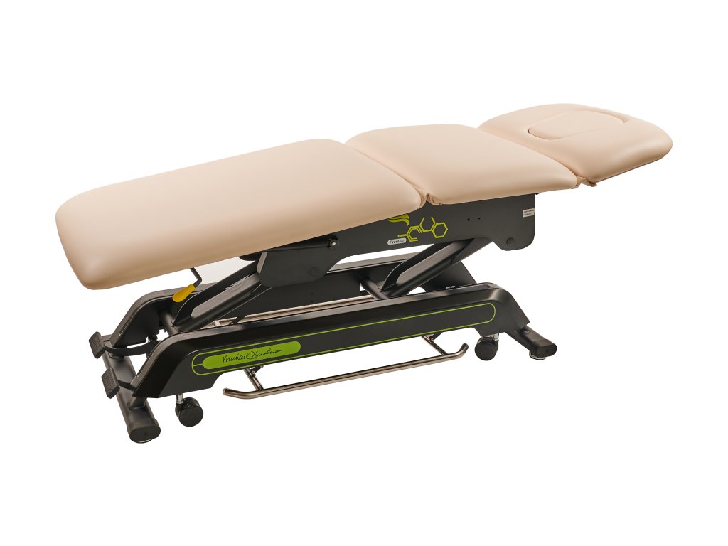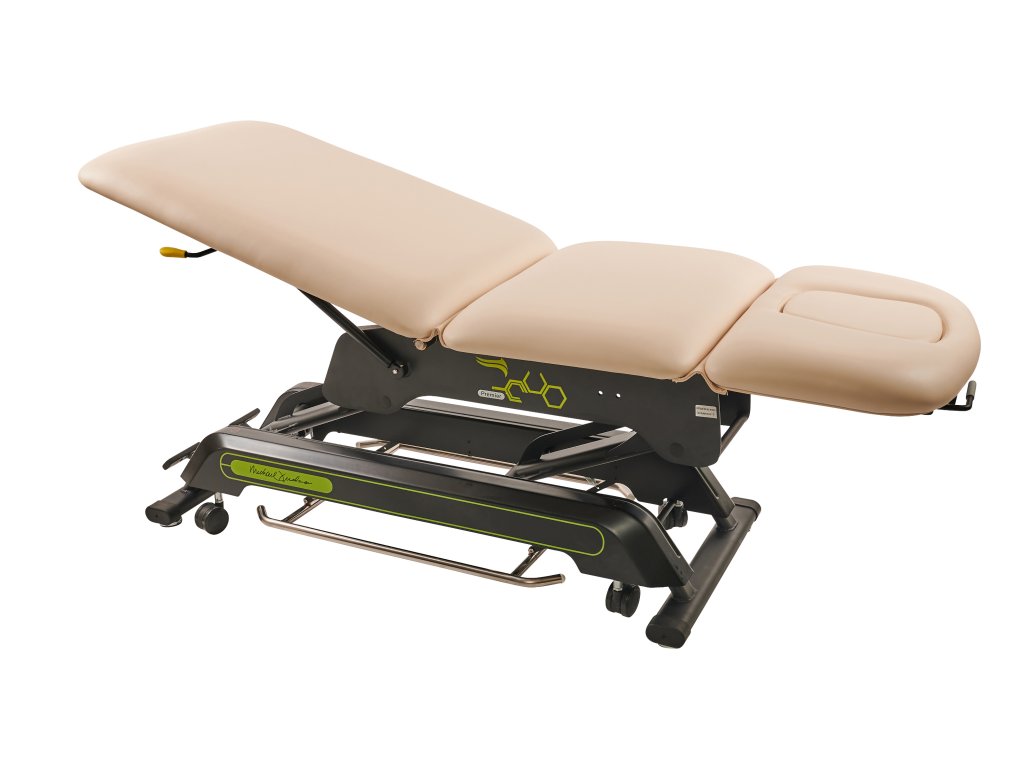 Elektricky nastavitelné lehátko s příjemně silným polstrováním. V ceně kolečka – centrální zdvih.
