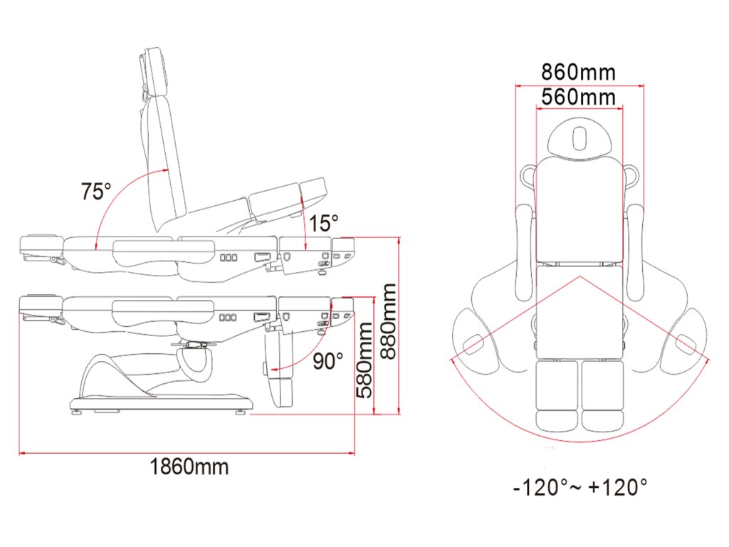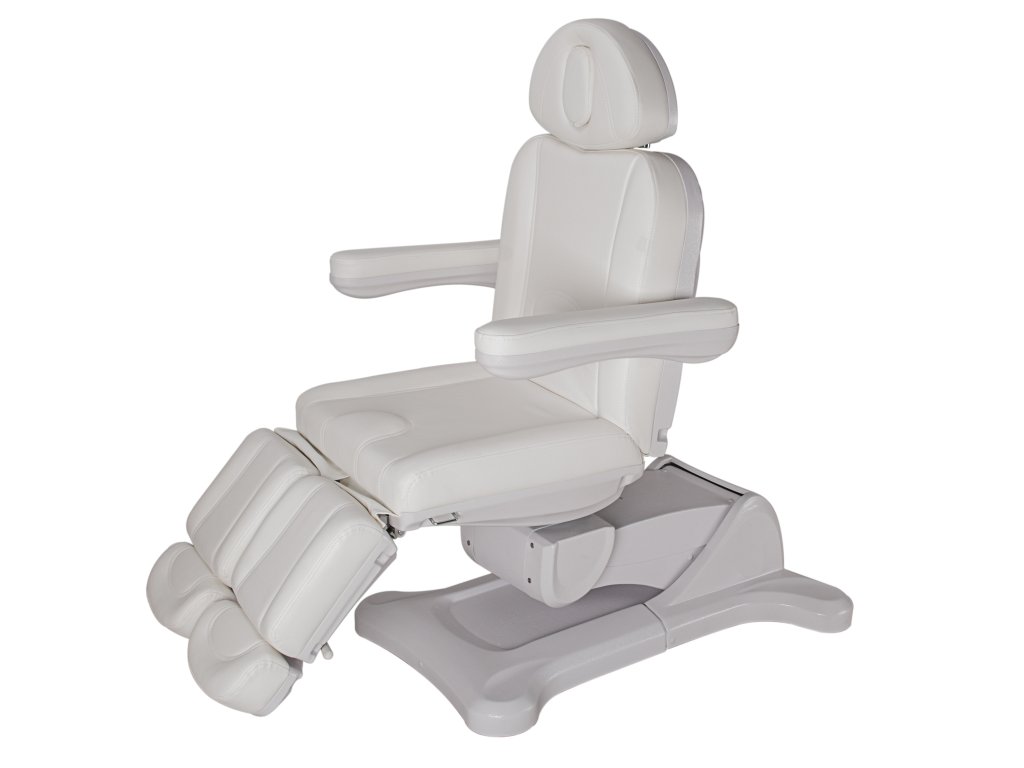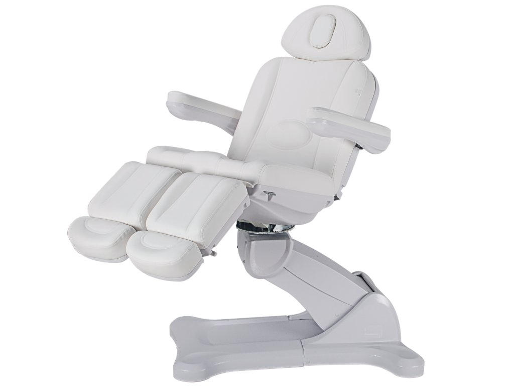 Pedikérské křeslo s elektricky nastavitelnou výškou, zádovou opěrou, sedákem a podnožkami (nožními částmi, nezávisle). S těmito možnostmi získáte širokou škálu nastavení.