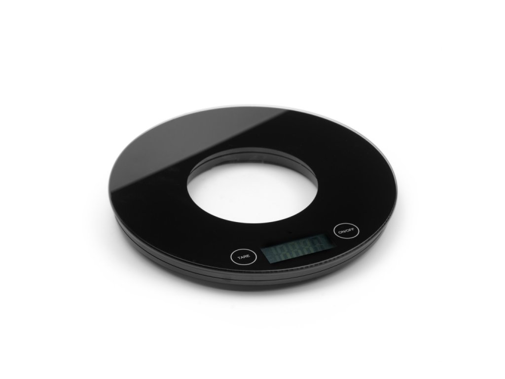Digitální elektronická váha se skleněnou deskou o průměru 19cm. Maximální nosnost 5000g.