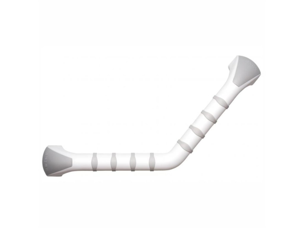 Zalomené koupelnové madlo Etac HANDY zajišťuje čtyři základní funkce: pomáhá při dosedání, pomáhá při vstávání, podporuje při sezení a zajišťuje bezpečnou podporu během přesedání. Madlo má na povrchu protiskluzové gumové kroužky, které umožňují bezpečné a pohodlné uchopení madla.