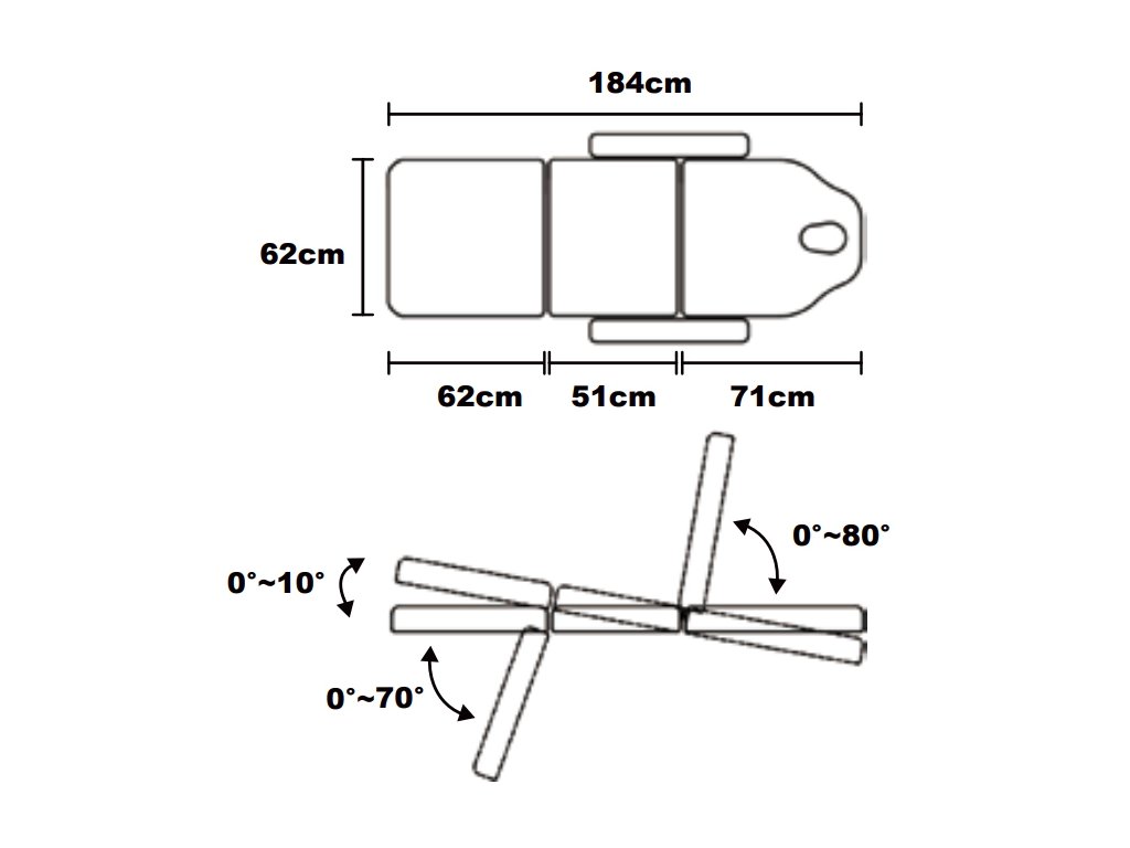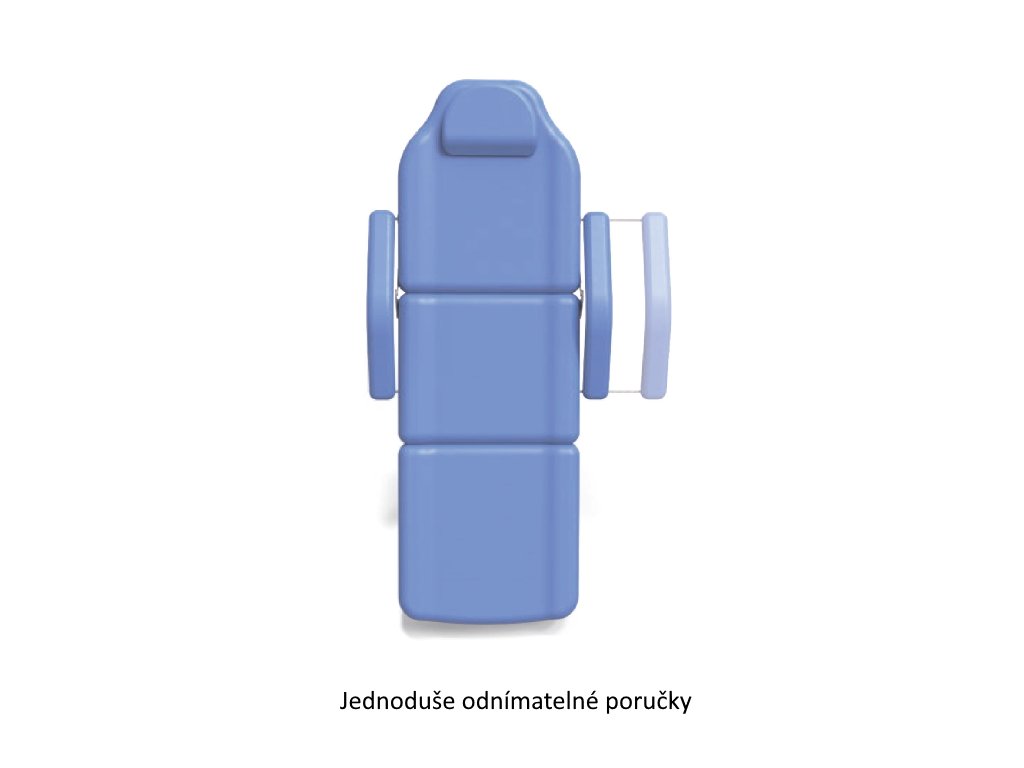 Jednoduše nastavitelná zádová a nožní sekce pomocí pístu. Křeslo lze nastavit do vodorovné pozice. Odnímatelná pokrývka v zádovém dílci (po vyjmutí otvor na obličej). Jednoduše odnímatelné opěrky na ruce.
