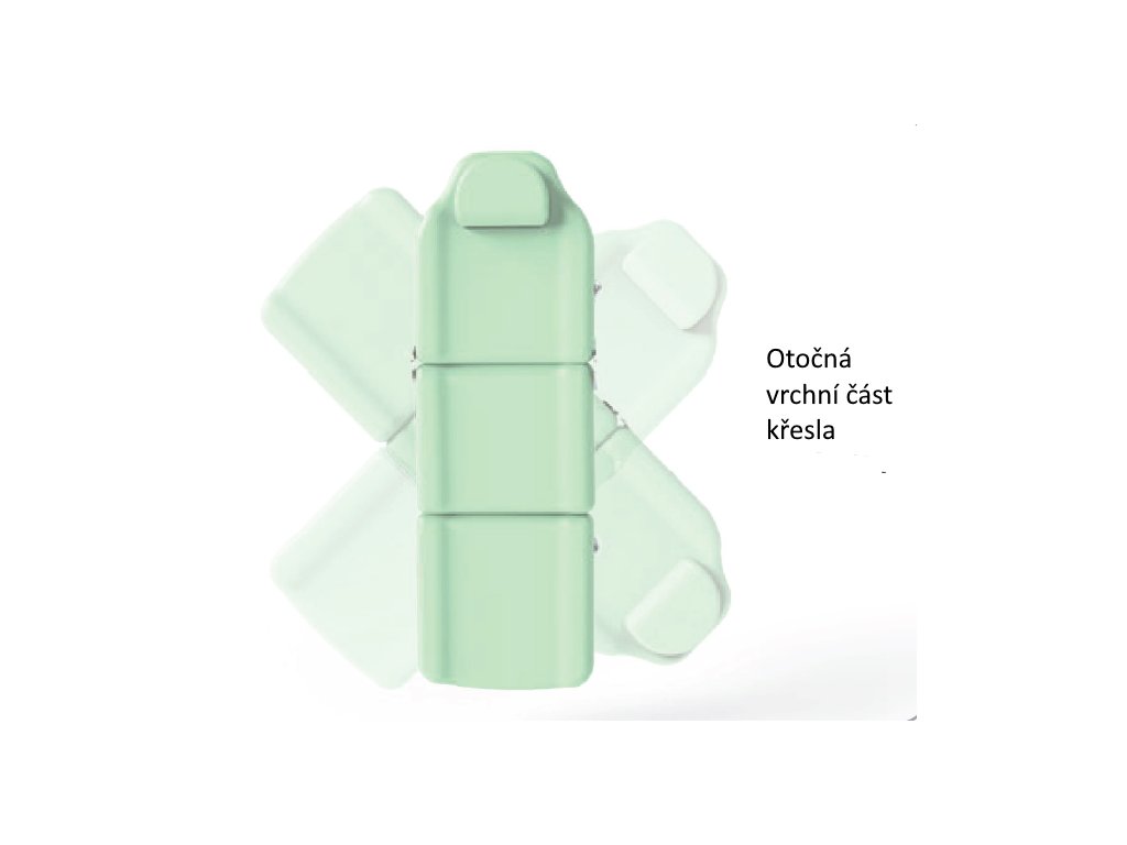 Křeslo lze nastavit do vodorovné pozice. Odnímatelná pokrývka v zádovém dílci (po vyjmutí otvor na obličej). Jednoduše odnímatelné opěrky na ruce.