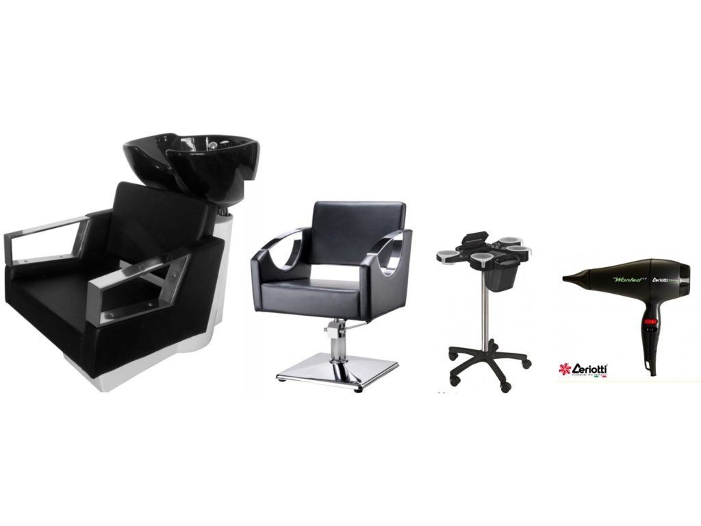 Kadeřnickou sestavu 1+1+1+1, Milano tvoří jeden Mycí box 3573, jedno elegantní pohodlné Kadeřnické křeslo 3938, jeden Ceriotti Kadeřnický vozík Service Plus a navíc profesionální značkový fén Ceriotti Fén Wanted – black line. Tato klasická sestava je ideální pro moderní interiéry.