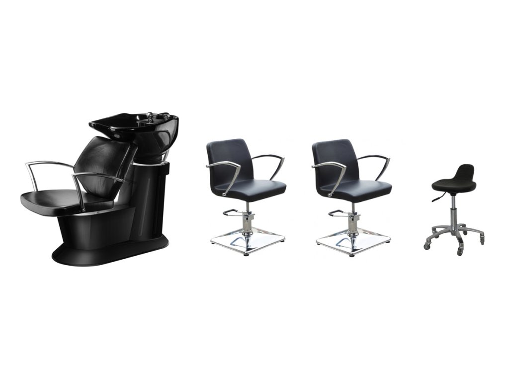 Kadeřnickou sestavu 1+2+1, Helene tvoří jeden mycí box 3565, dvě pohodlné kadeřnické křesla A005 a jedna Židle E022 – černá. Tato klasická sestava je ideální pro moderní interiéry.