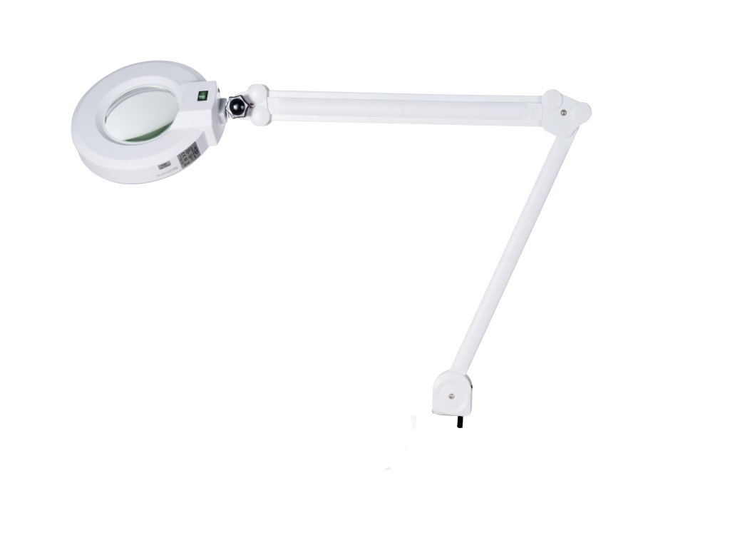 Kosmetická lampa s lupou s úchytem na stůl. Na konci konstrukce lampy je