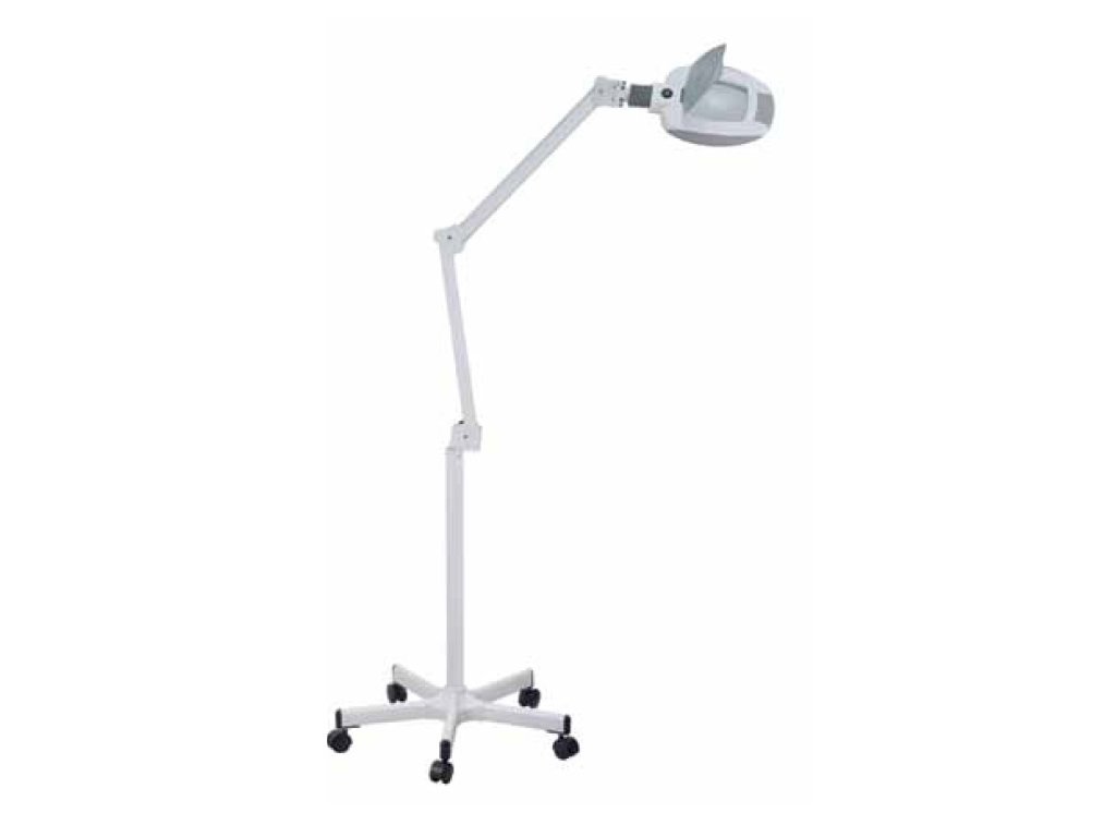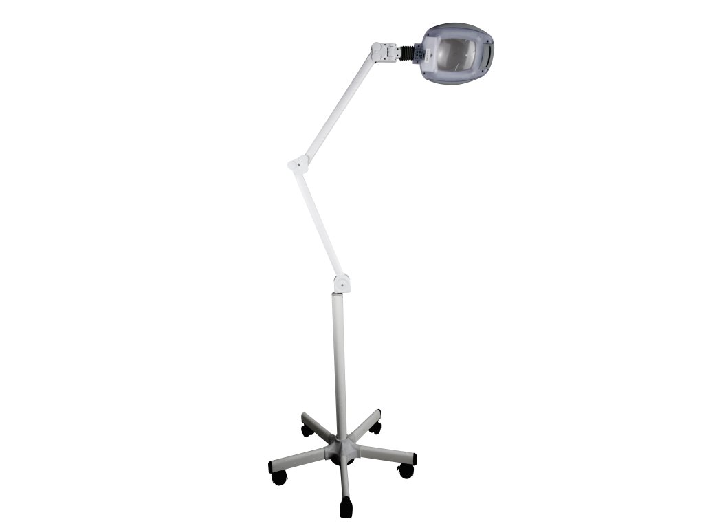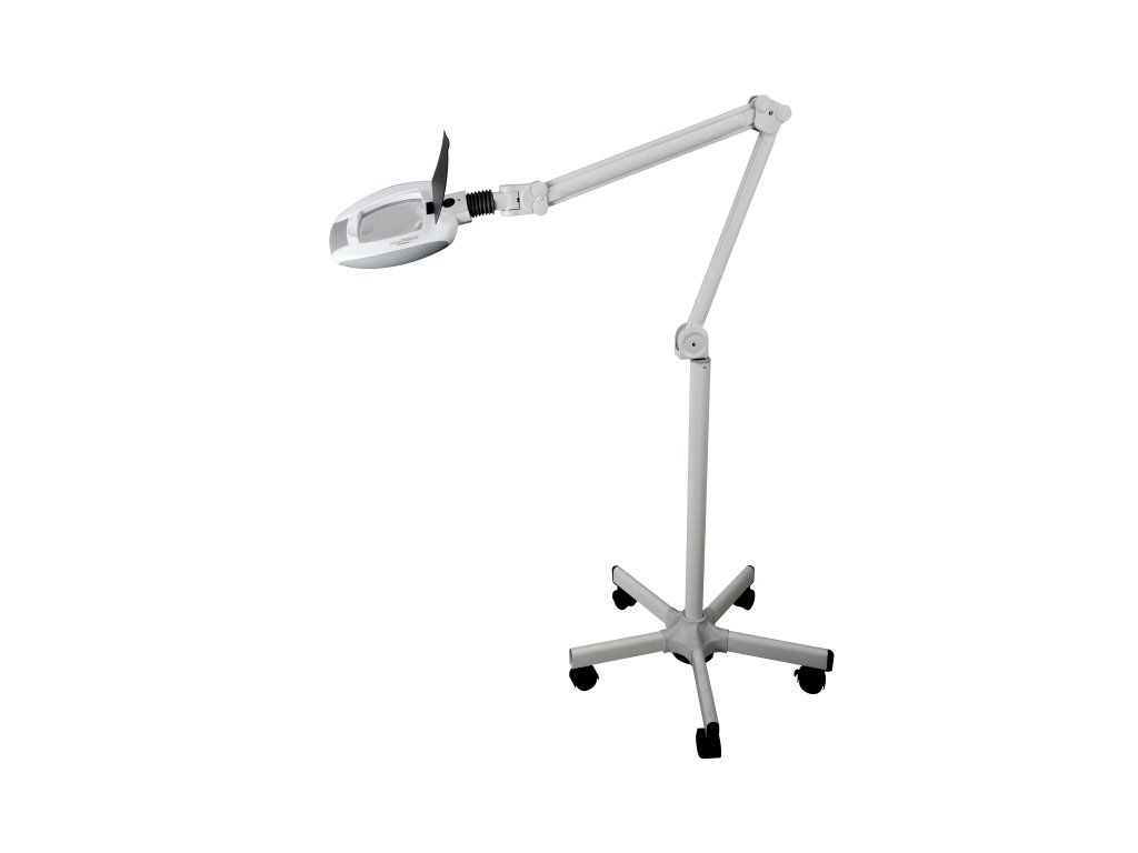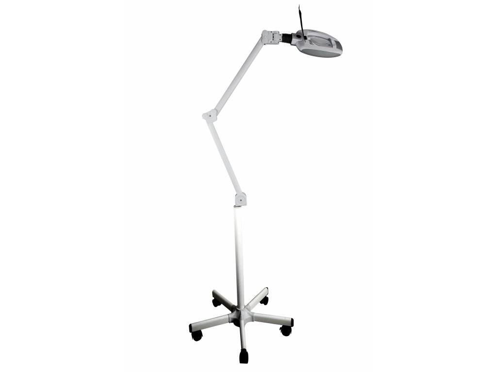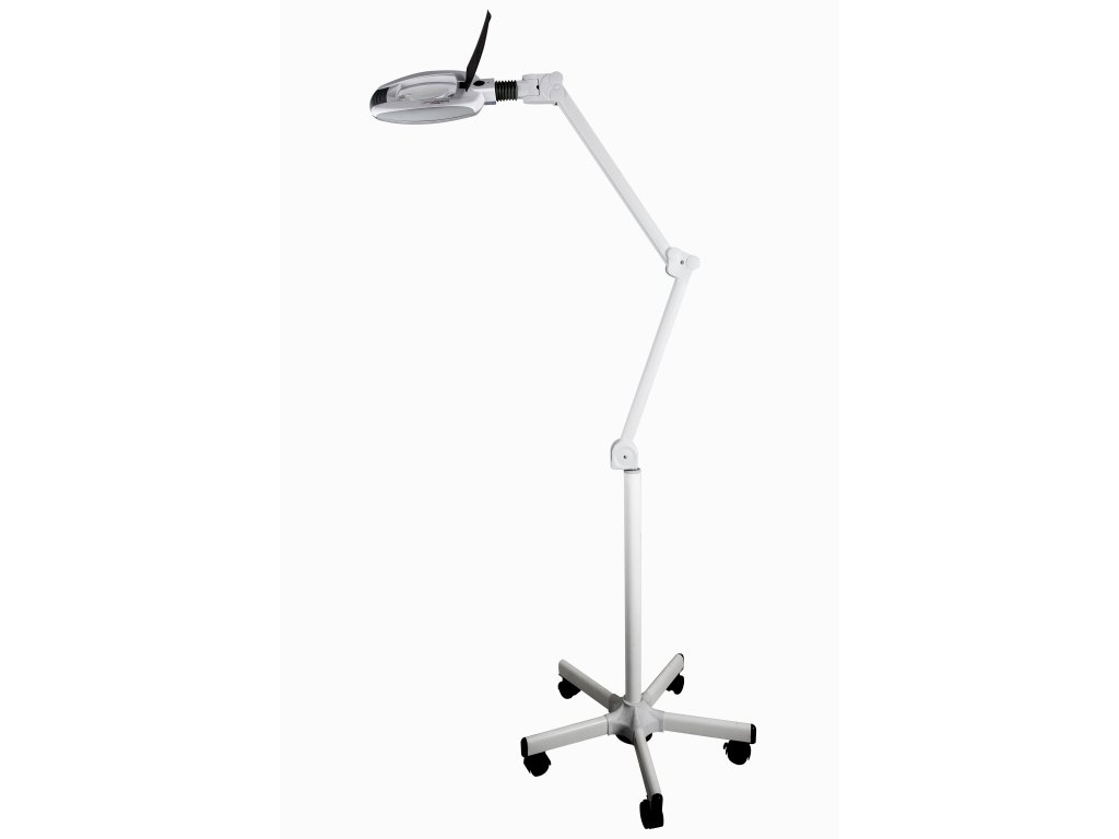 Kosmetická lampa s lupou včetně stojanu na kolečkách. Lampa je otočná