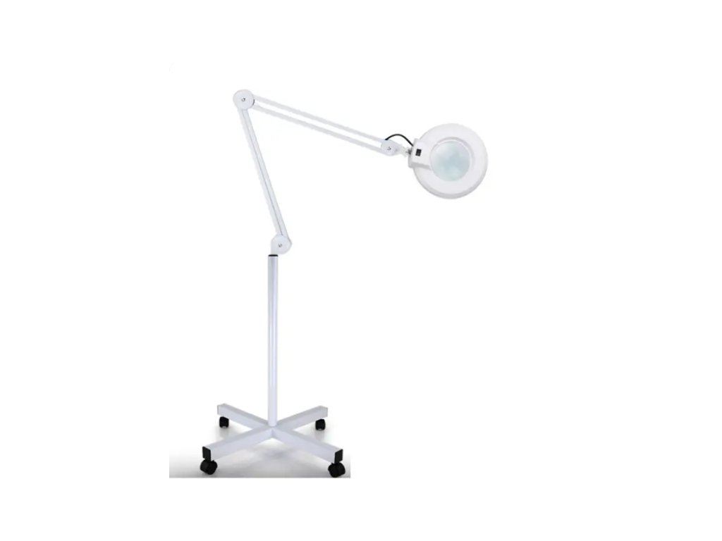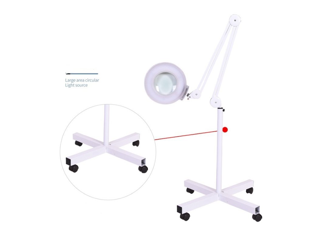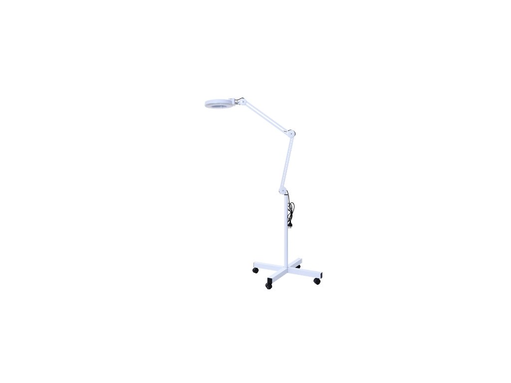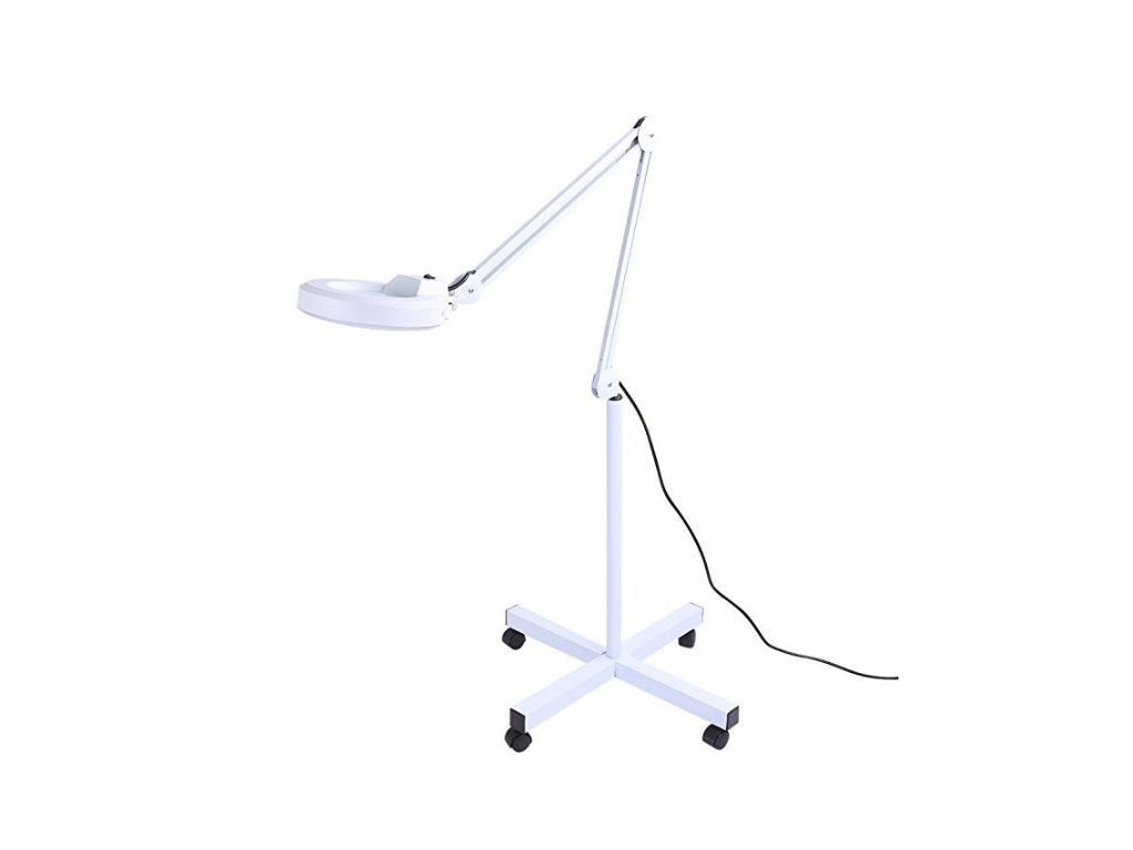 Kosmetická lampa s lupou včetně stojanu na kolečkách. Lampa je otočná