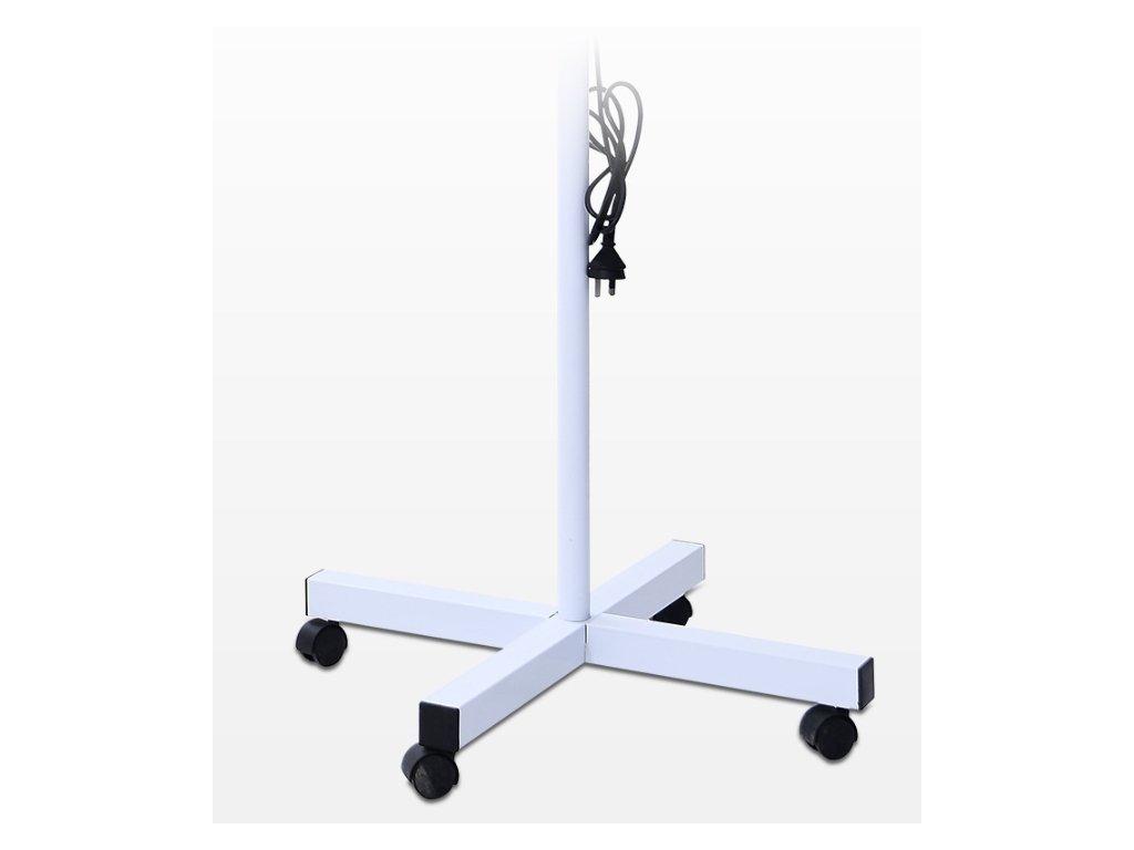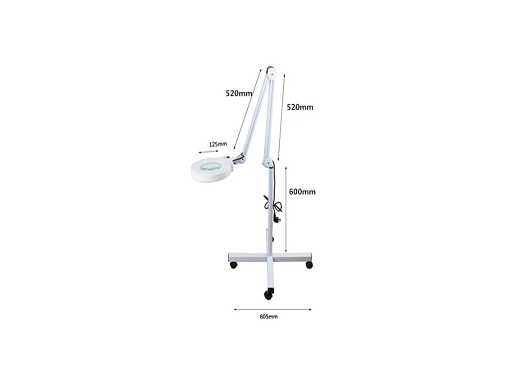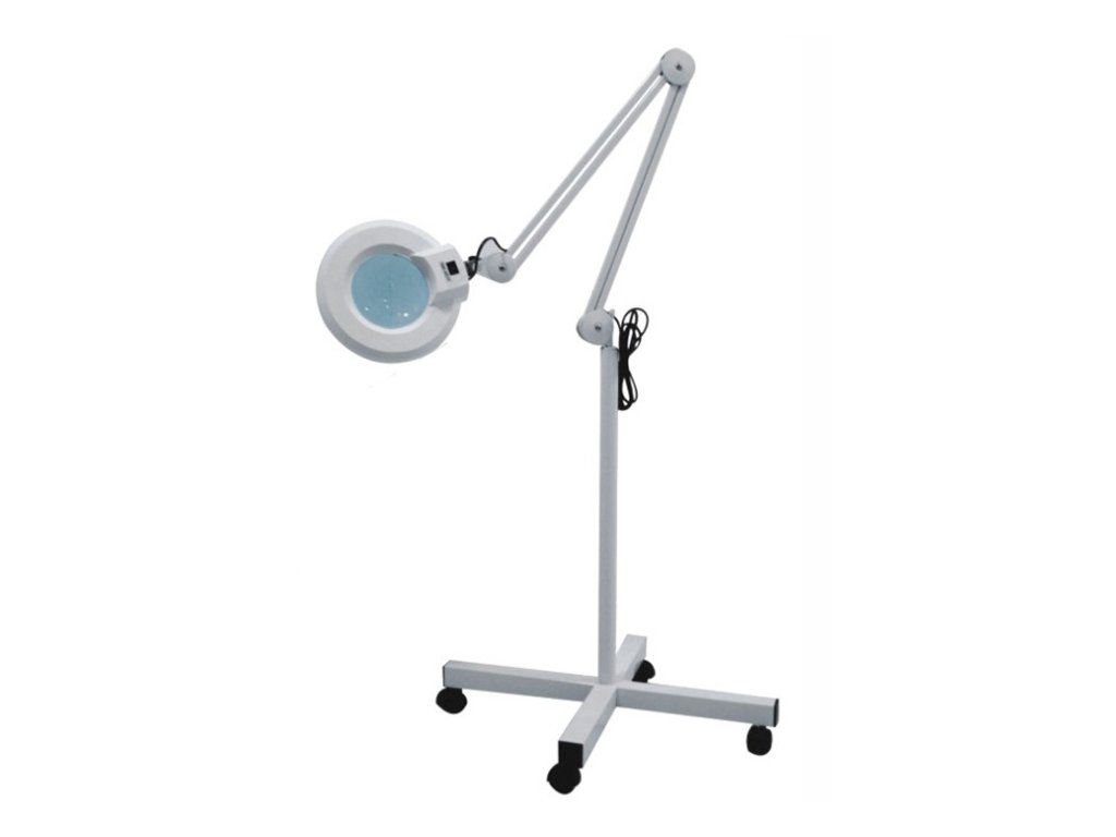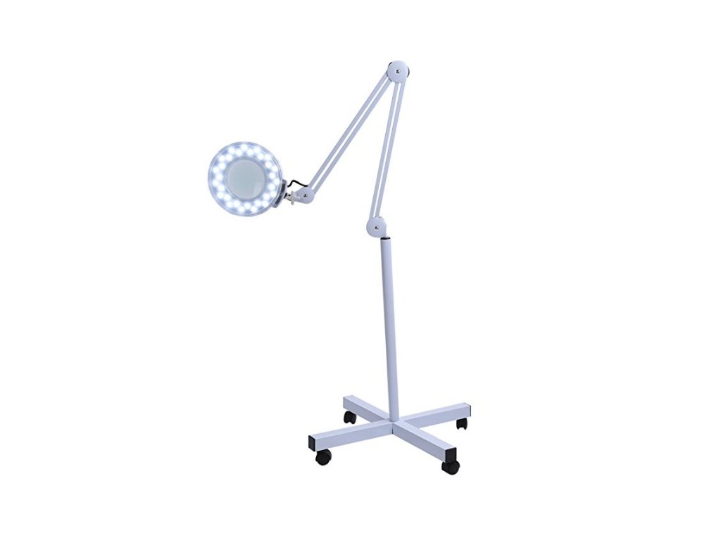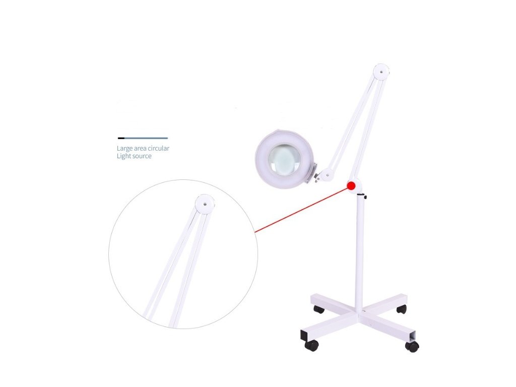 Kosmetická lampa s lupou včetně stojanu na kolečkách. Lampa je otočná