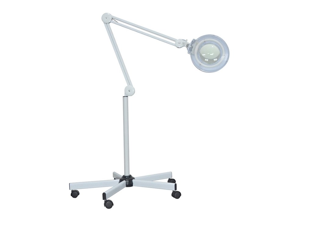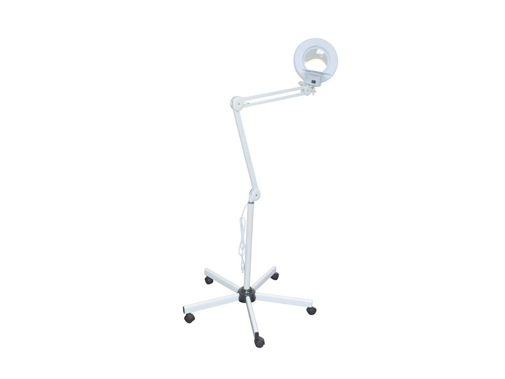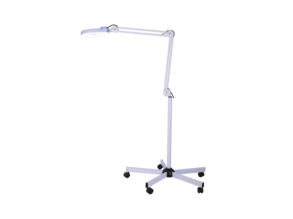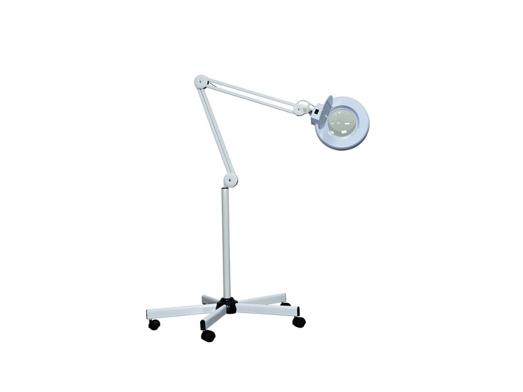Kosmetická lampa s lupou včetně stojanu na kolečkách. Lampa je otočná