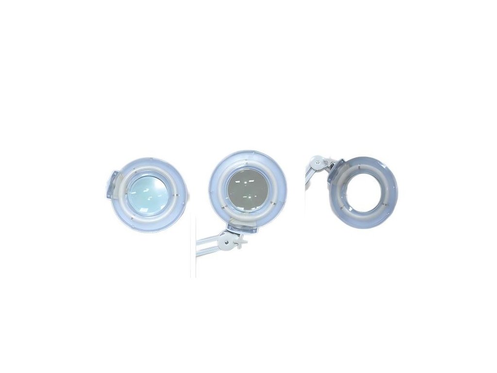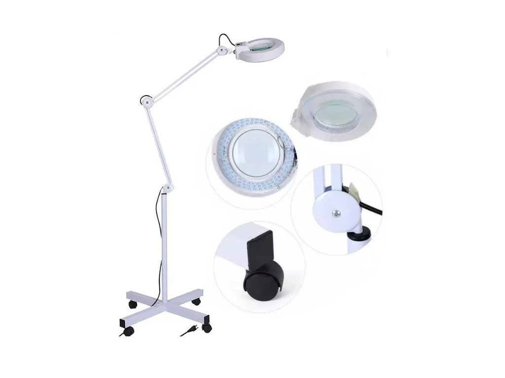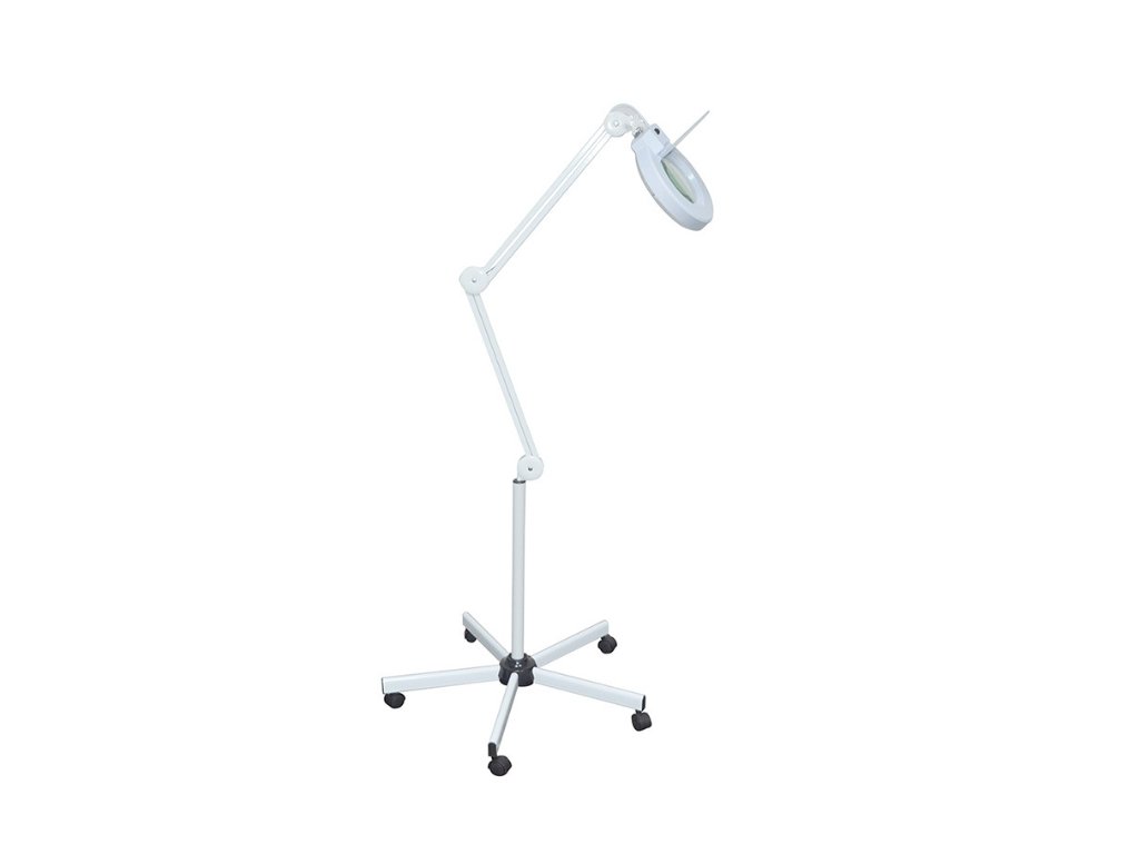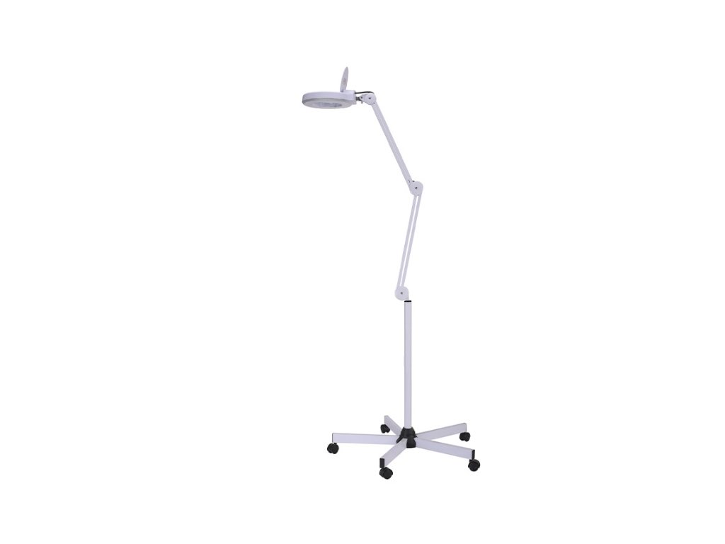 Kosmetická lampa s lupou včetně stojanu na kolečkách. Lampa je otočná