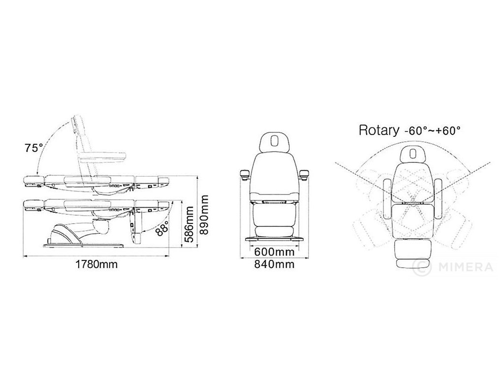 Kosmetické lehátko MABEL PLUS E4 s vyhříváním je jako jedno z mála otočných křesel na trhu. Má 4 motory, kterými se reguluje výška, zádová a nožní opěrka a sklon lehátka. Ovládání je pomocí tlačítok zabudovanými v zádové a sedací části a ručním ovladačem, který je součástí balení. Dvě funkce LOCK a RESET umožňují zafixovat zvolenou polohu, popřípadě vrátí lehátko do výchozí polohy.