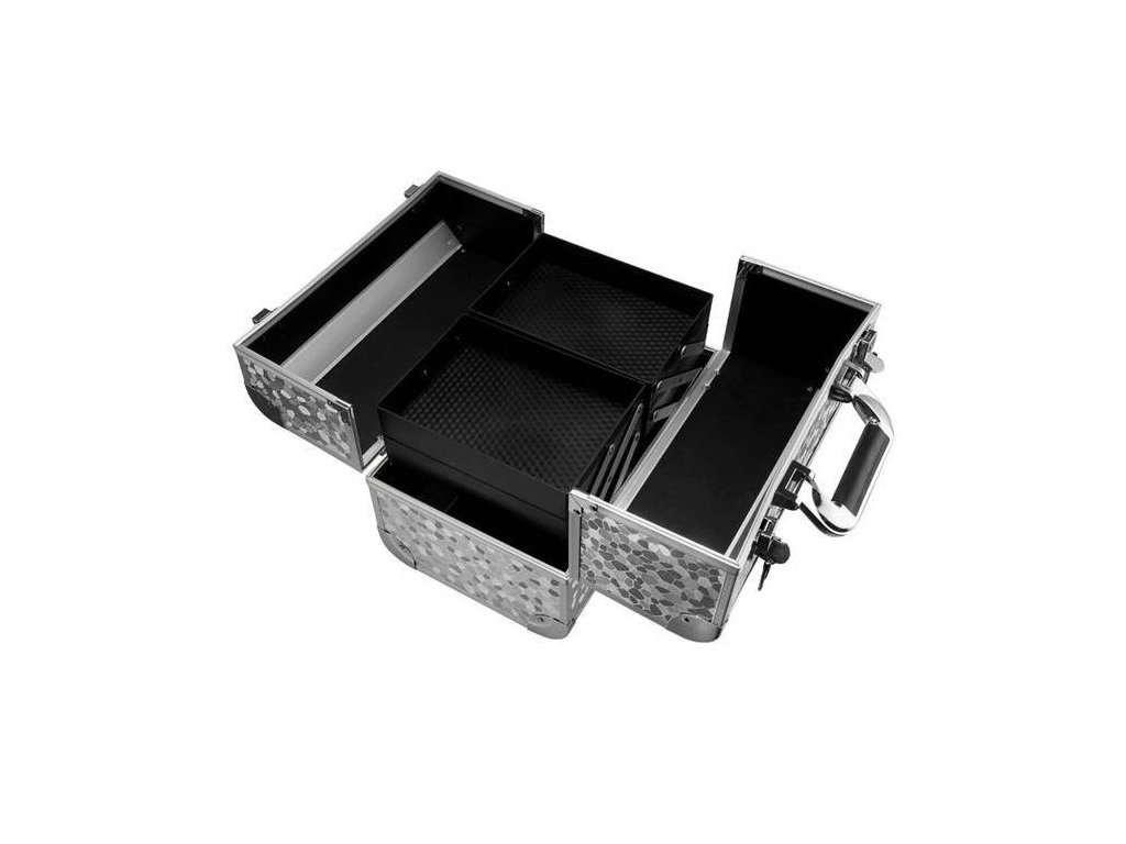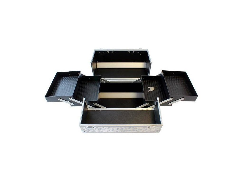 Šikovný kufřík pro přepravu a skladování kosmetiky nebo jiných drobností, ochrání vaši kosmetiku před poškozením mnohem lépe než tašky a batohy. Nezbytné vybavení pro kosmetičky a stylisty. Je vybaven 4 výklopnými policemi a prostornou hlavní přihrádkou zdobenou měkkým materiálem, který chrání její obsah.