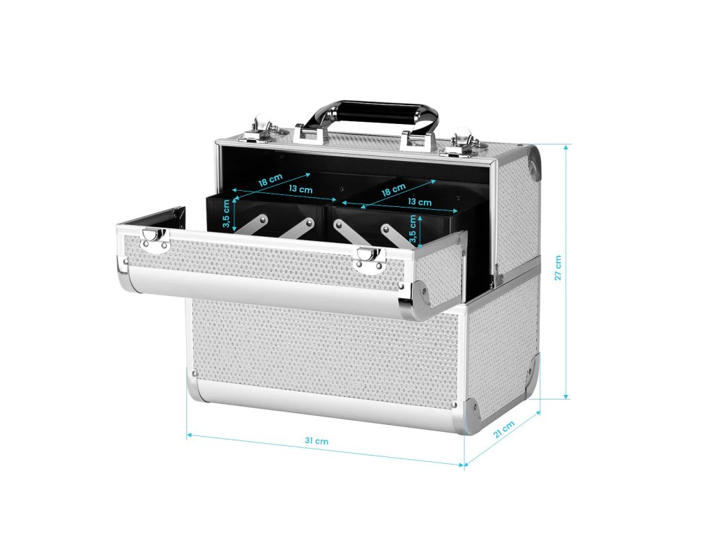 Elegantní kosmetický kufřík je kombinací funkčnosti a stylu a zajišťuje pohodlnou organizaci, bezpečné uložení a rychlý přístup k základním nástrojům. Je ideální pro každodenní použití, zejména pro mobilní stylisty. Prostorný interiér s výsuvnými policemi umožňuje organizovat příslušenství a prostorná přihrádka pojme vrtačku na nehty, přípravky nebo další potřebné nástroje.