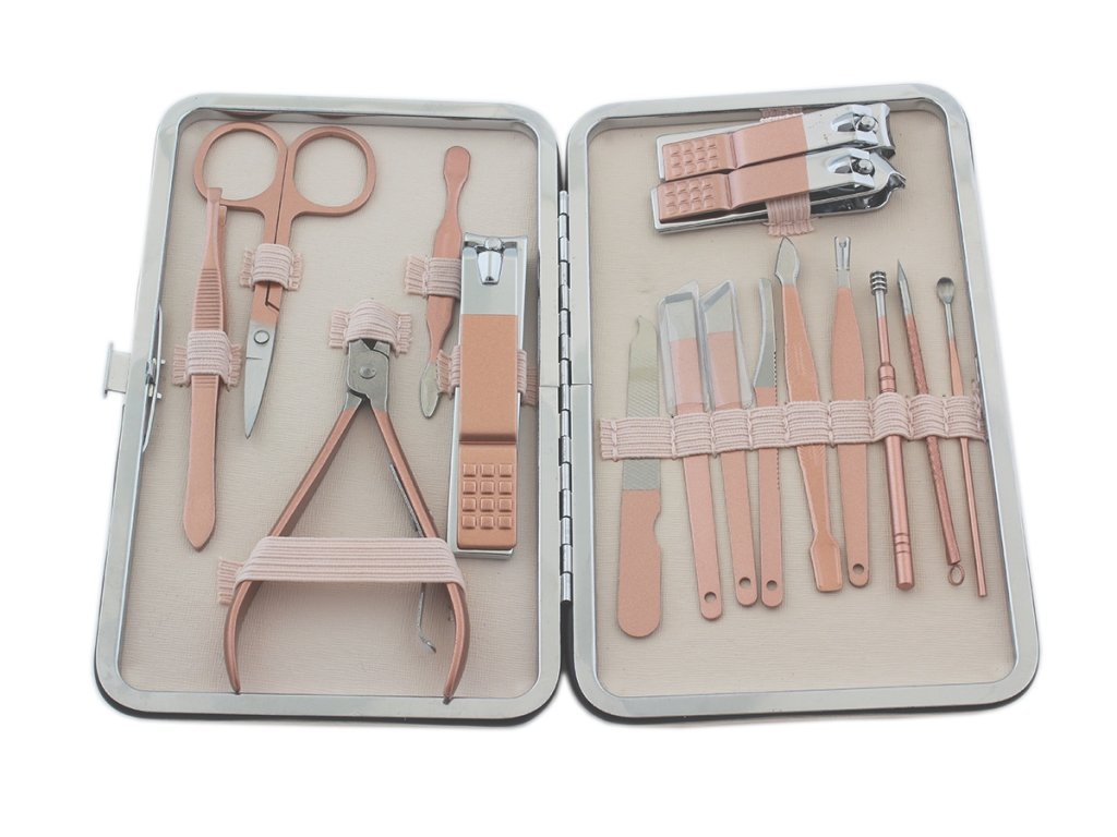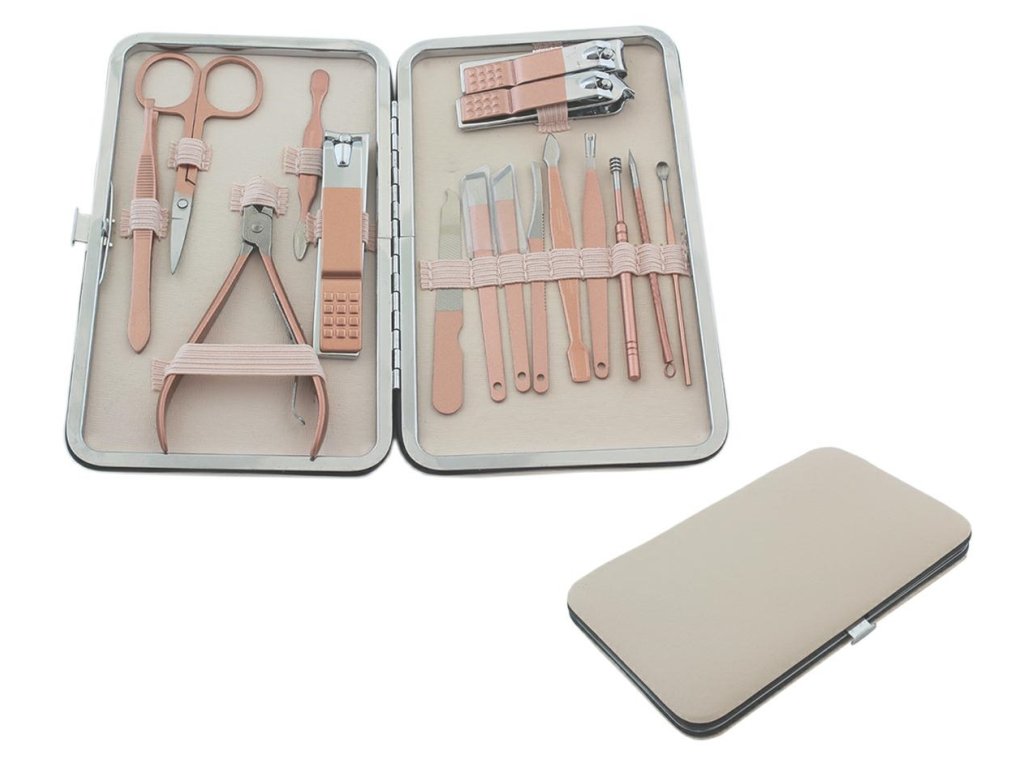 Mimořádně praktická sada nástrojů pro pedikúru, manikúru a další ošetření nehtů. Vybaveno 16prvky, jako jsou nůžky, kleště a další viz obrázek. Všechny nástroje jsou vyrobeny z vysoce kvalitní nerezové oceli, bezpečné při kontaktu s pokožkou. Vše je zabaleno v estetickém uzavíratelném pouzdře, které usnadňuje přenášení a skladování sady. Díky ergonomickému tvaru a dobrému profilování nástroje perfektně padnou do ruky a zajišťují pohodlnou práci. Nezapomeňte po každém použití nástroje sterilizovat!