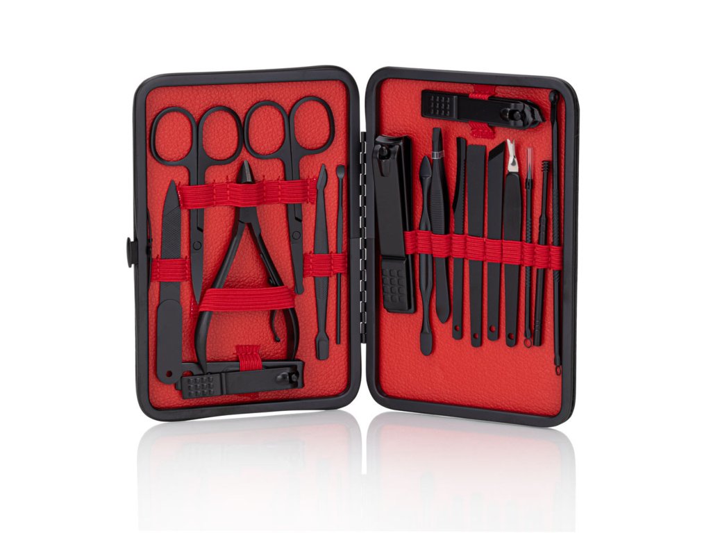 Mimořádně praktická sada nástrojů pro pedikúru, manikúru a další ošetření nehtů. Vybaveno 18prvky, jako jsou nůžky, kleště a další viz obrázek. Všechny nástroje jsou vyrobeny z vysoce kvalitní nerezové oceli, bezpečné při kontaktu s pokožkou. Vše je zabaleno v estetickém uzavíratelném pouzdře, které usnadňuje přenášení a skladování sady. Díky ergonomickému tvaru a dobrému profilování nástroje perfektně padnou do ruky a zajišťují pohodlnou práci. Nezapomeňte po každém použití nástroje sterilizovat!