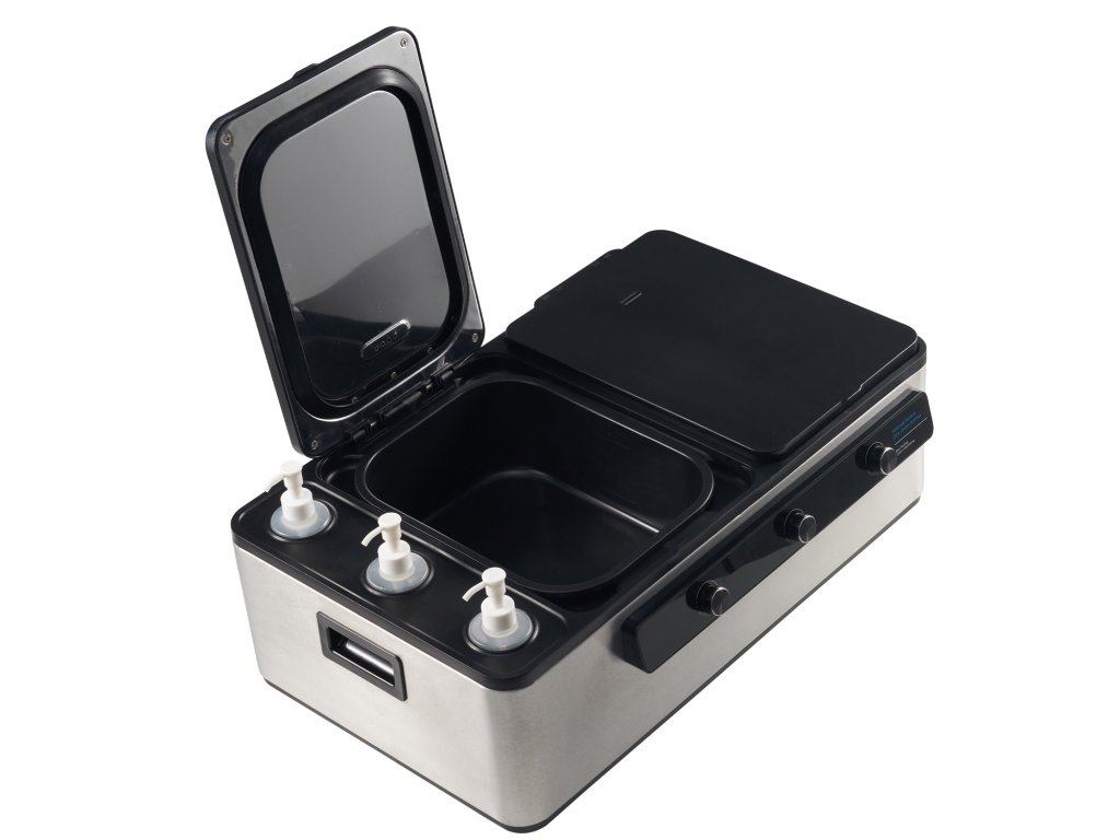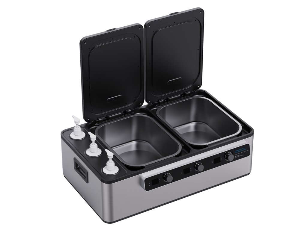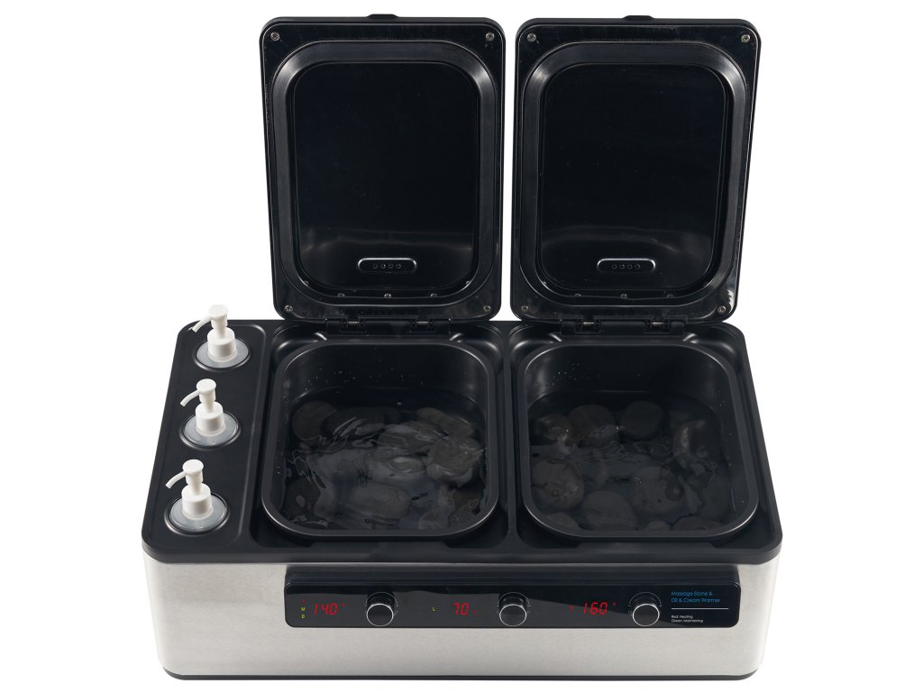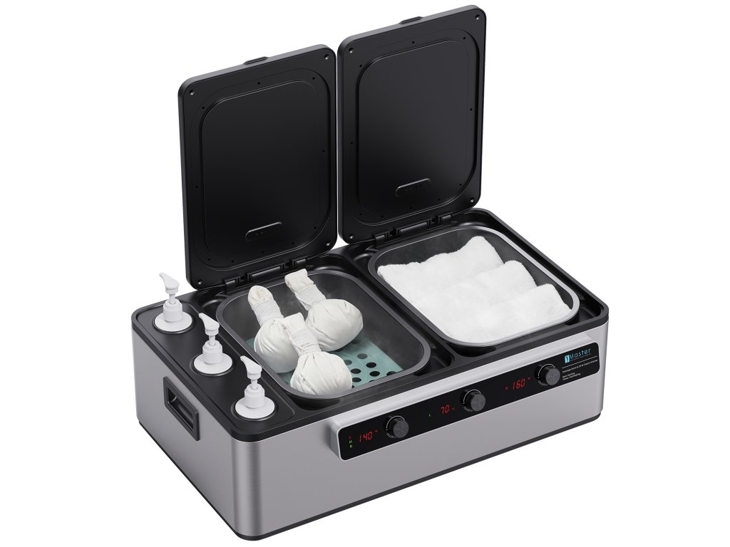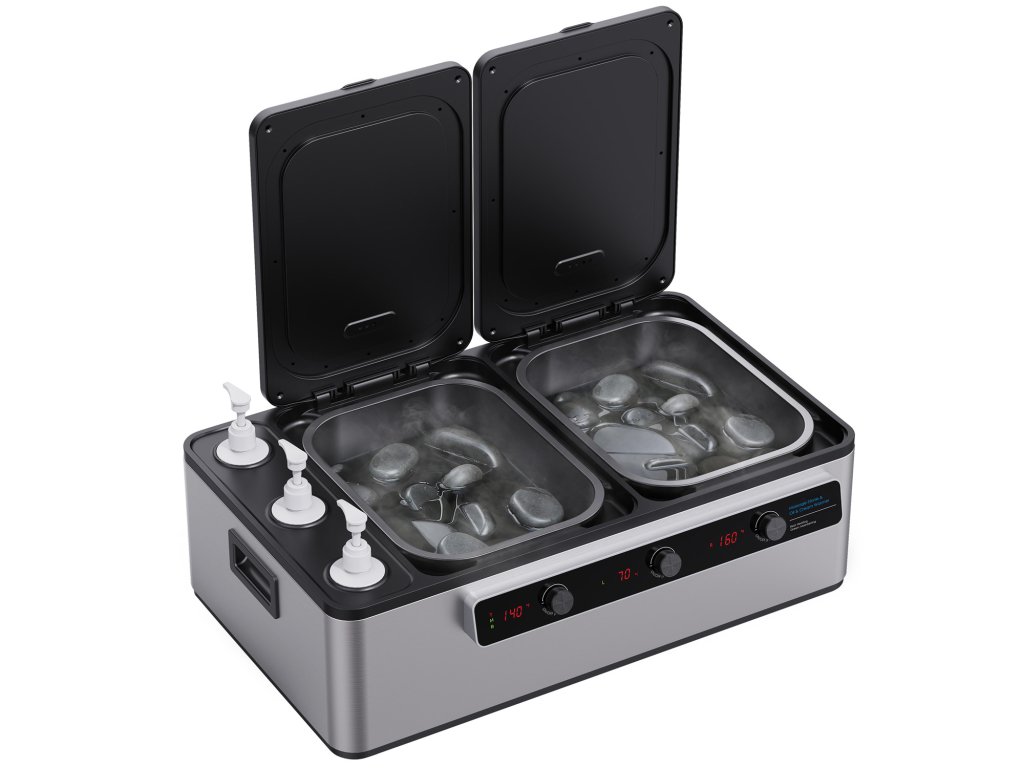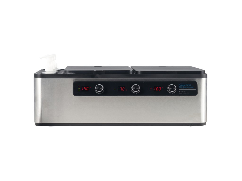 Ohřevový přístroj se třemi nezávislými zónami ohřevu. Regulátor teploty masážních olejů 40–60°C. Regulátor teploty nádob 40–70°C.