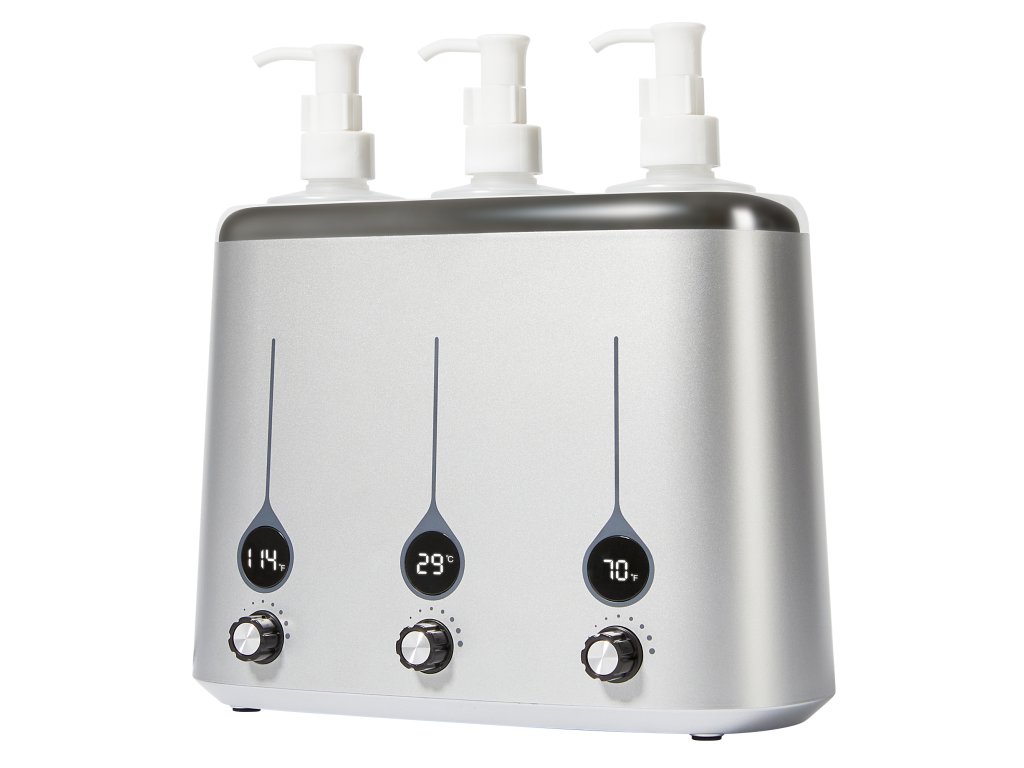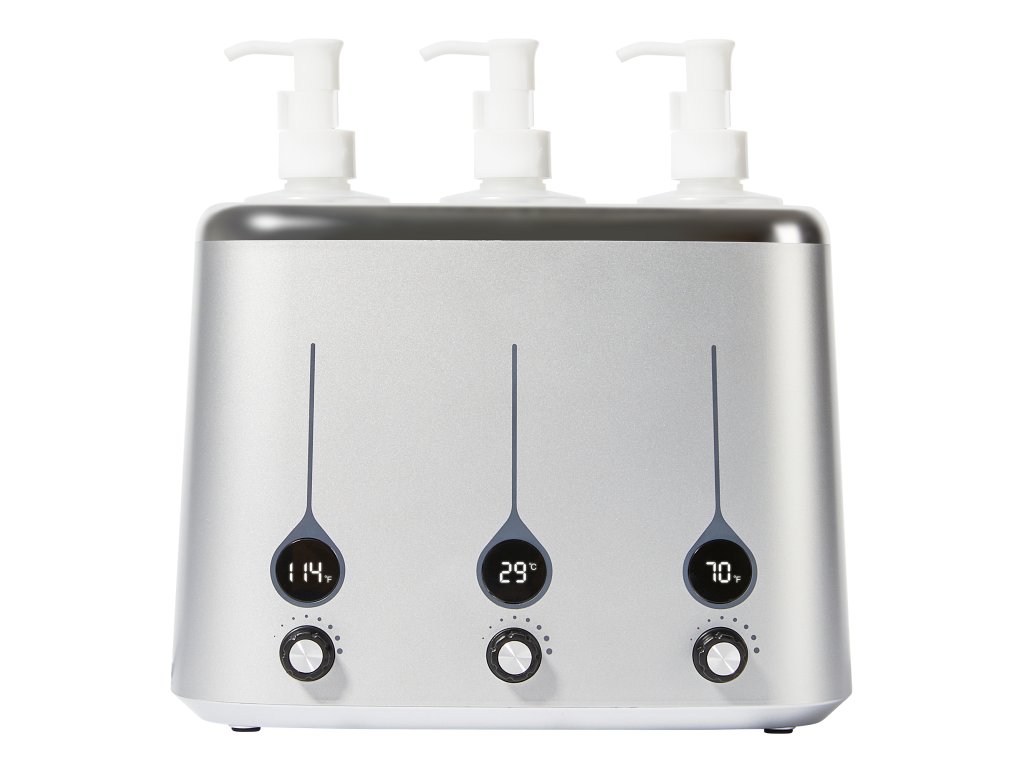 Ohřívač masážních olejů na tři láhve s displeji vyobrazujícími jednotlivé teploty a funkcí rychlého ohřevu. Balení obsahuje kvalitní HDPE nádoby na olej. Jednoduché intuitivní ovládání.