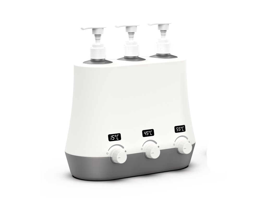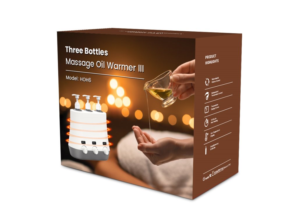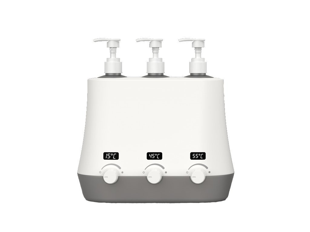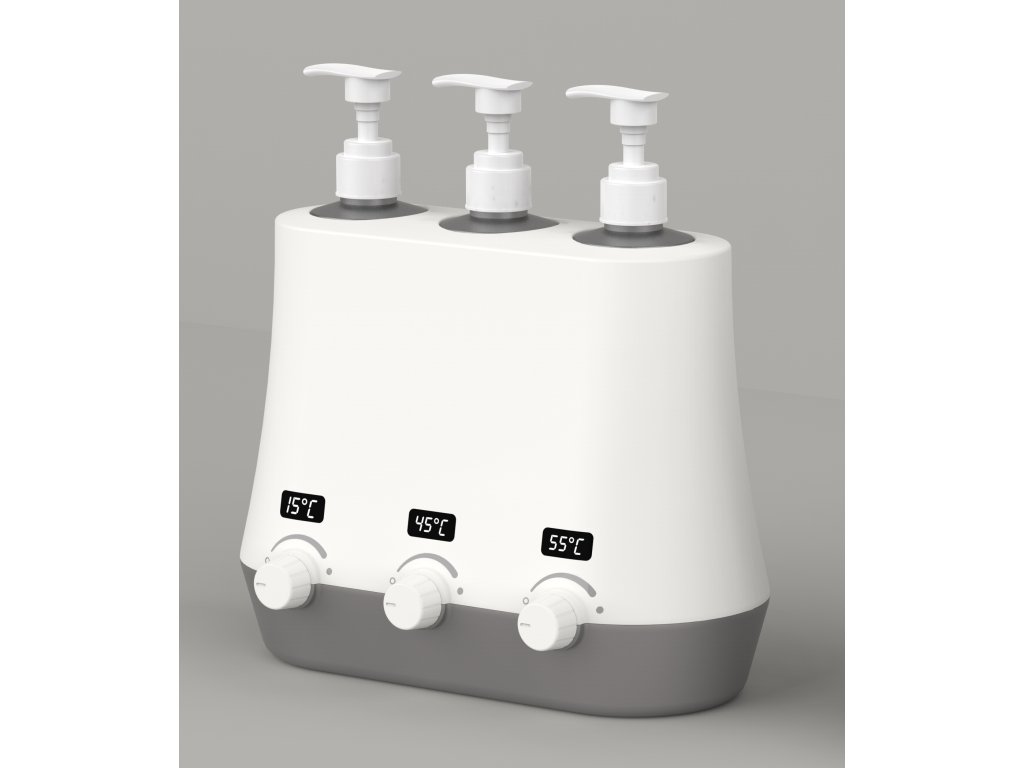 Ohřívač masážních olejů na tři láhve s displeji vyobrazujícími jednotlivé teploty a funkcí rychlého ohřevu. Balení obsahuje kvalitní HDPE nádoby na olej. Jednoduché intuitivní ovládání.