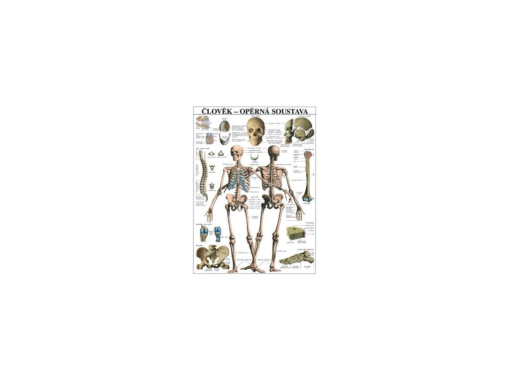 Výuková tabule obsahuje informace o kostře, lebce a čelistech, páteři a pánvi. České a latinské popisky. Velikost 67 x 96 cm.