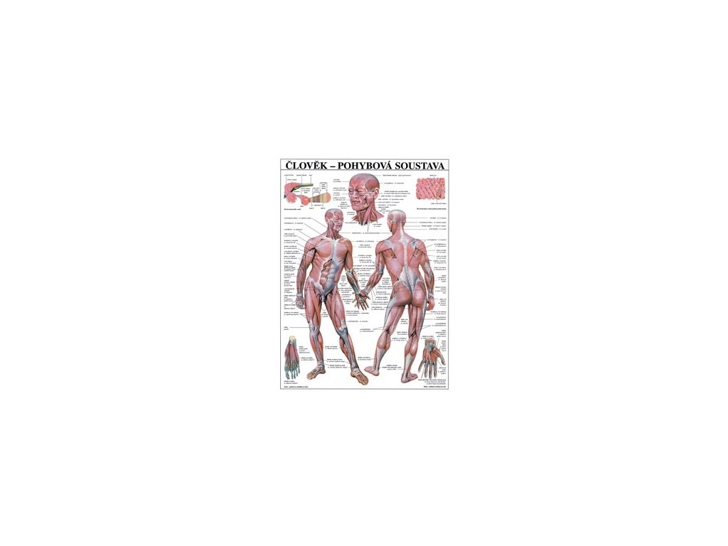 Plakát Pohybová soustava shrnuje nejdůležitější informace o anatomii svalové soustavy lidského organismu.