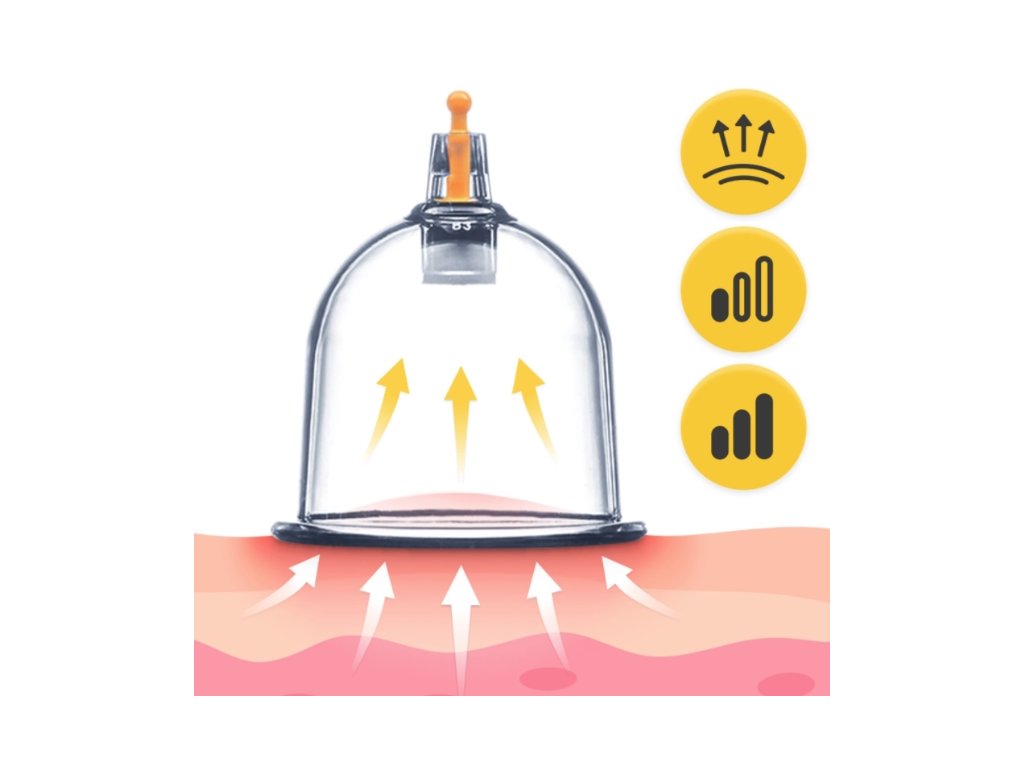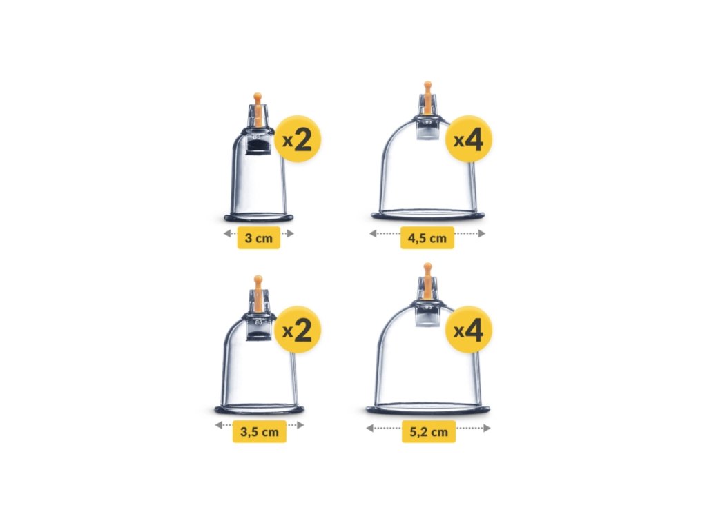 Sada obsahuje 24 plastových baněk v 8 velikostech, vakuovou pumpu, magnetické koncovky a hadičku pro snadnou aplikaci i na těžko dostupná místa (např. záda). Intenzitu sání lze jednoduše regulovat, takže je použití bezpečné a vhodné i pro začátečníky.