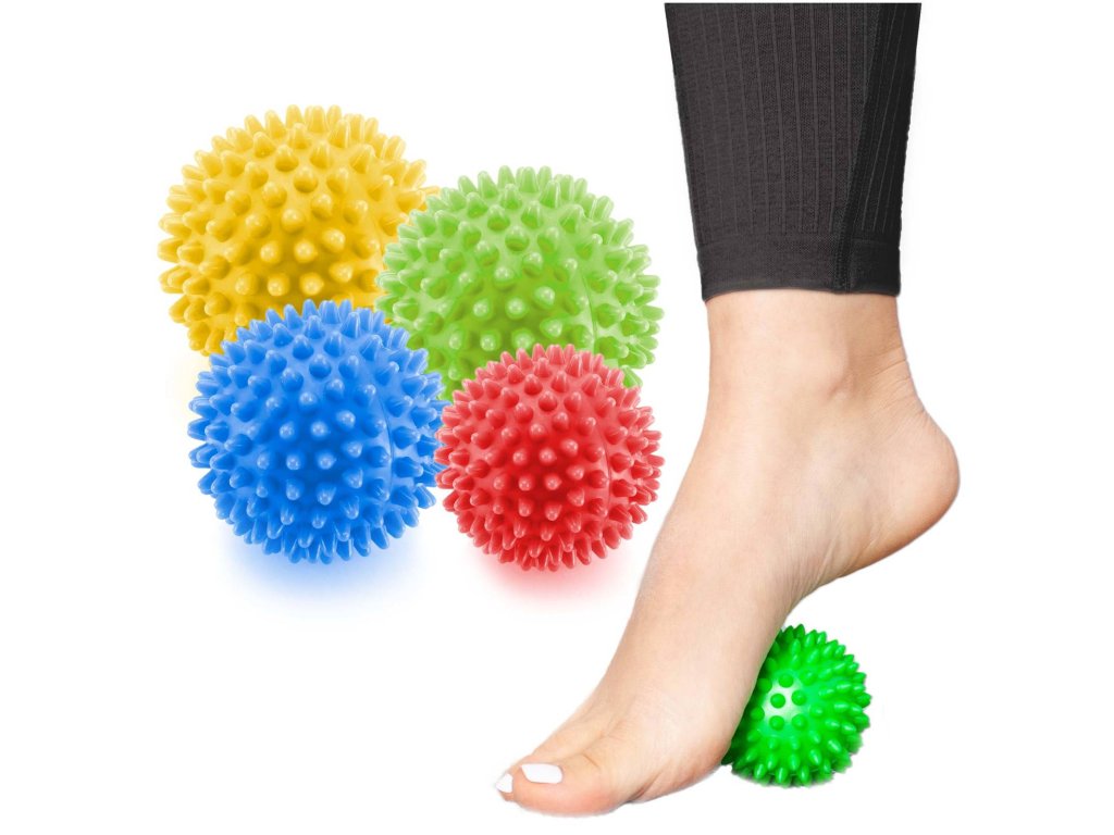 Masážní míčky s bodlinkami, sloužící k uvolnění příliš napjatých svalů.