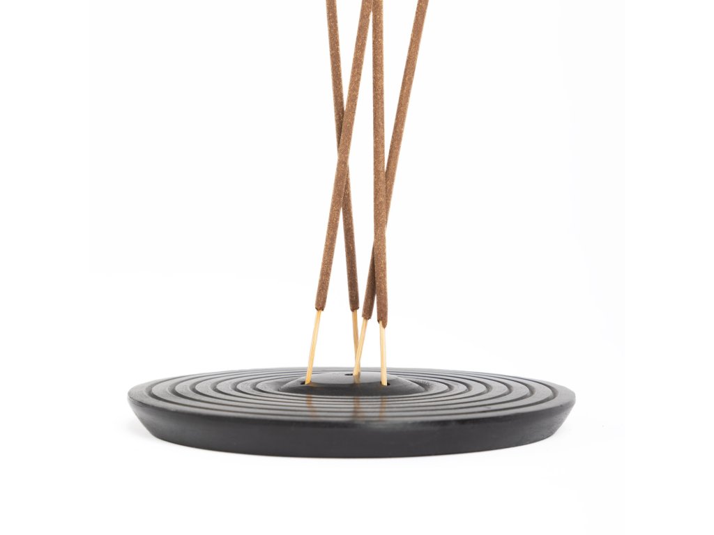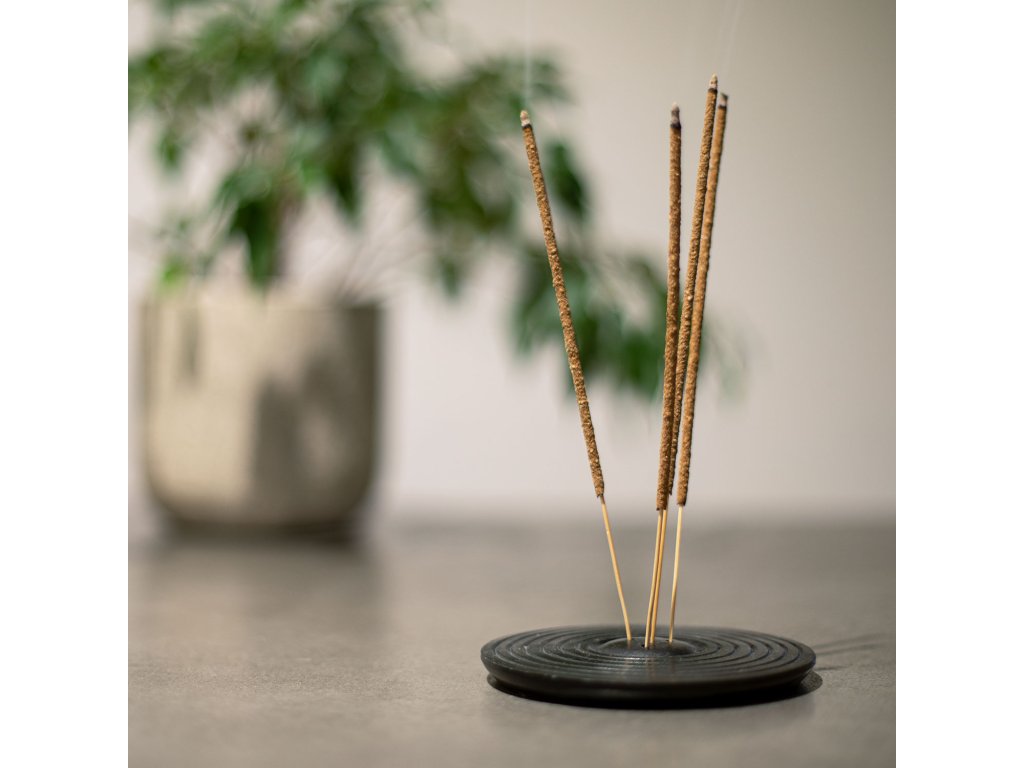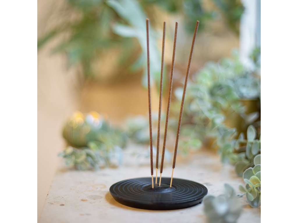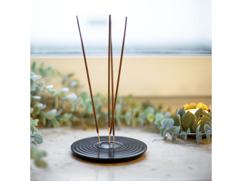 V duchu nadčasového japonského stylu nabízí tento držák prostor jak pro klasické vonné tyčinky, tak i pro vonné kužely. Černý matný přírodní kámen v kulatém tvaru má několik soustředných rýh, které připomínají zenové zahrady. Díky svému minimalistickému designu se snadno začlení do nejrůznějších prostředí.