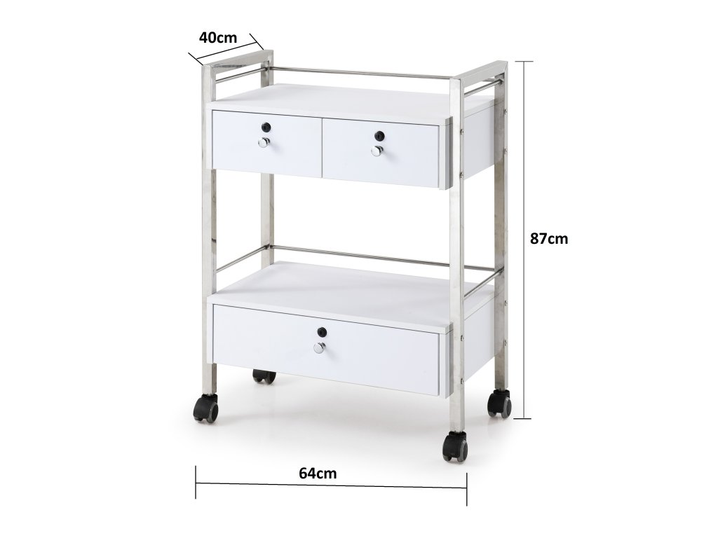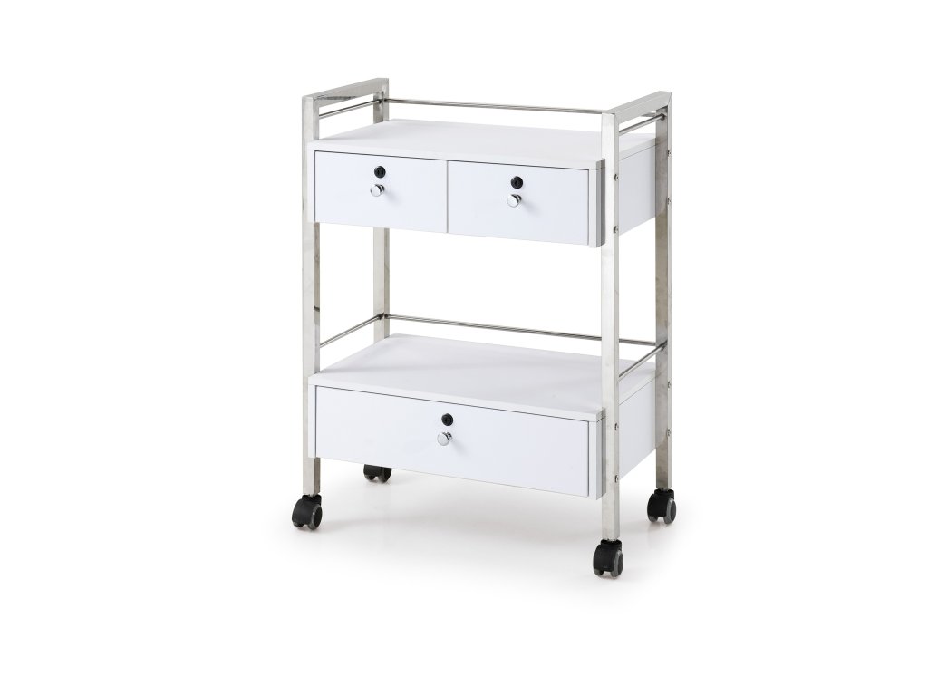 Pěkně zpracovaný, stylový. silný a stabilní stolek se třemi zásuvkami. Tento všestranně využitelný, uzamykatelný stolek je vhodný jak do kadeřnictví, tak do salonů pro pedikúru a manikúru. Stolek je pojízdný.
