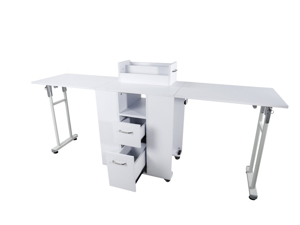 Praktický designový skládací stolek, který lze jednoduše složit. Rozložit lze volitelně na obě strany. Má dvě menší a jednu větší odkládací zásuvku k odkládání nástrojů a dalšího příslušenství nezbytného pro manikúru.