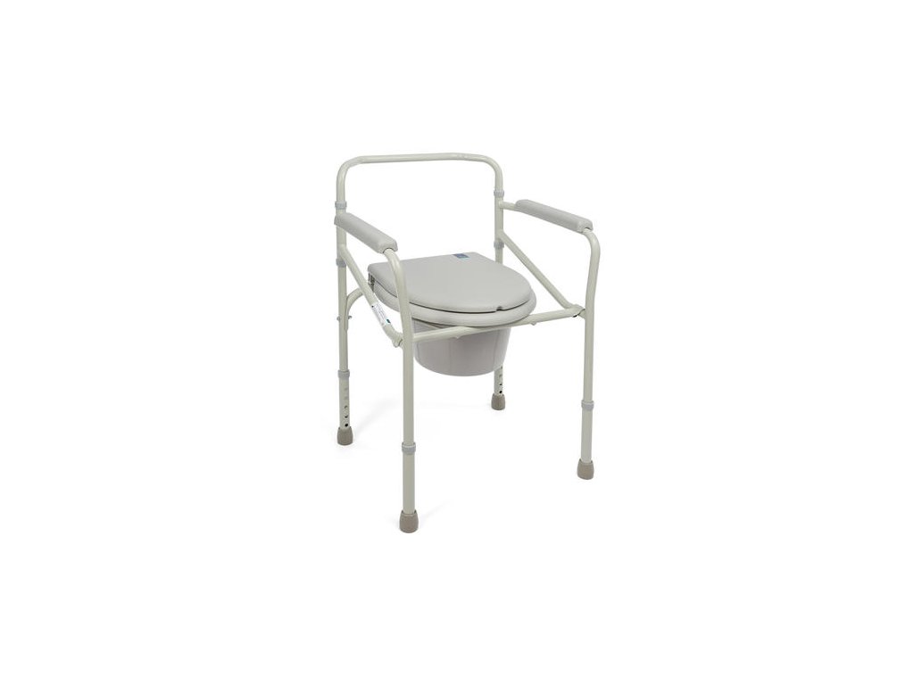 Rám křesla je z skládací, což usnadňuje skladování v době, kdy není křeslo používáno. Nohy jsou výškově nastavitelné a opatřeny protiskluzovými nástavci. Součástí je plastová sanitární nádoba s víkem, která je snadno vyjímatelná a záchodové prkénko s poklopem. Plastové boční područky zabezpečují stabilitu a bezpečnost použití.