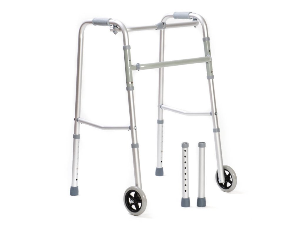 Trojfunkční skládací chodítko, které může být použito jako pevné, kloubové nebo dvoukolové chodítko.