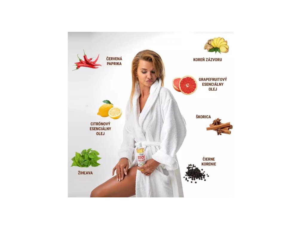 Jedinečnými složkami masážního oleje jsou přírodní olejové extrakty: červená paprika, skořice, pepř, kořen zázvoru, kopřiva, jakož i éterické oleje z grapefruitu a citronu.