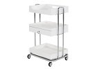 Kovový stolek s plastovými policemi a plastovým šuplíkem.