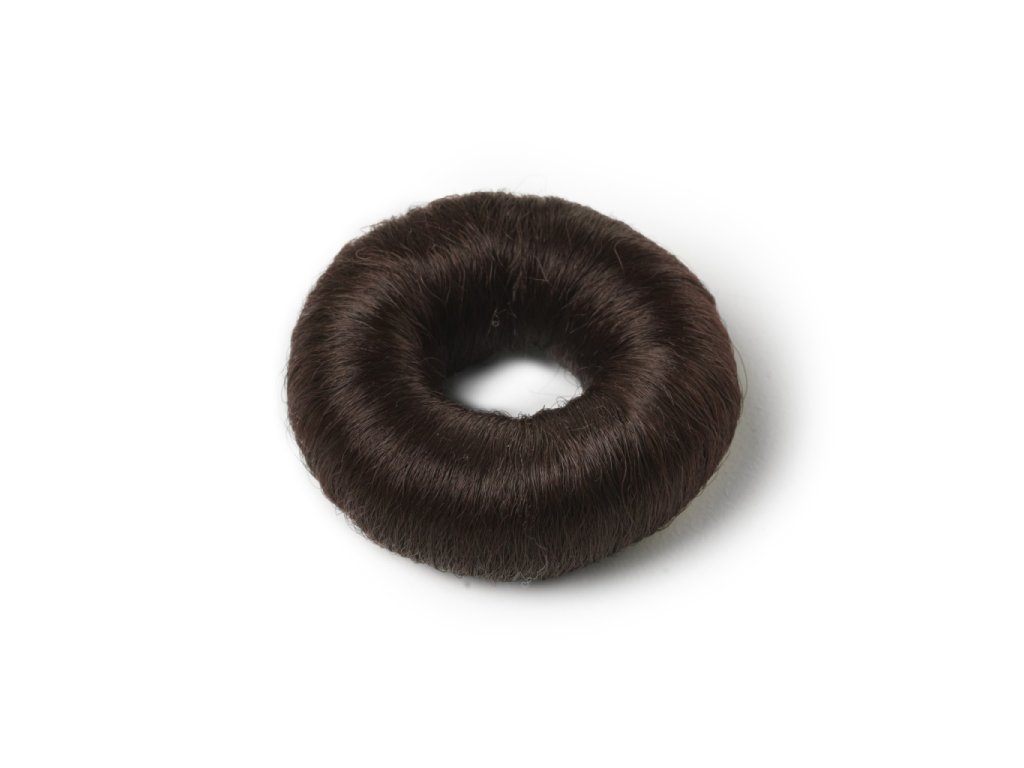Hnědá vlasová vycpávka vyrobená ze syntetických vlasů. Průměr 7,3cm.