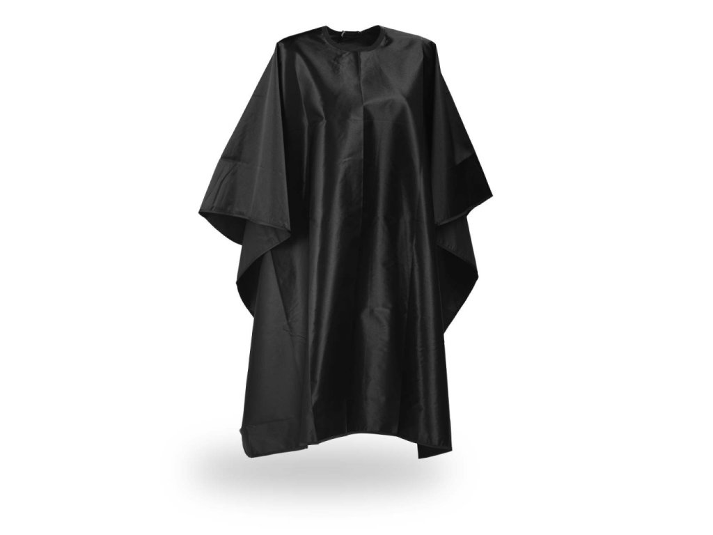 Černá stříhací pláštěnka. Materiál: 100 % nylonová tkanina. Díky použitému materiálu je pláštěnka hladká a vlasy se na pláštěnce nezachycují.